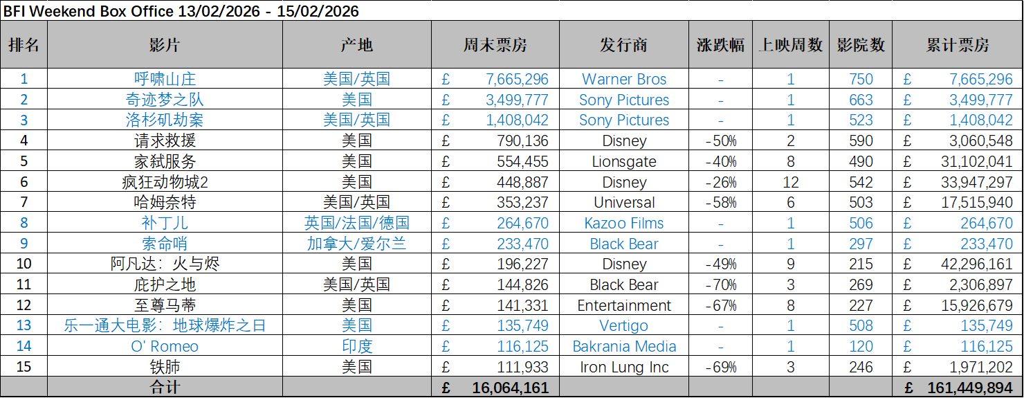 英国周末票房(2.13-2.15):1.《呼啸山庄》开画夺冠,为今年首周末票房成绩最高的影片;2. 索尼两部新片同时上映,《奇迹梦之队》成绩略胜一筹。(数据:BFI)