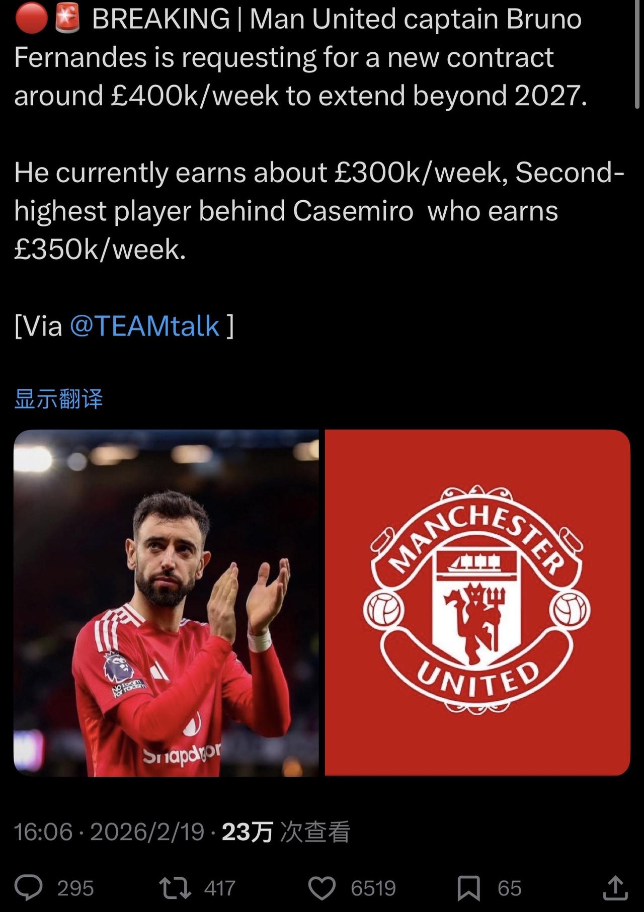 40万英镑周薪! 赶紧滚蛋😡,去沙特拿吧? ……………………………………………………………… 突发新闻 | 曼联队长布鲁诺·费尔南德斯要求一份周薪约 40 万英镑的新合同,将合同期限延长至 2027 年以后。 他目前的周薪约为 30 万英镑,是仅次于卡塞米罗(周薪 35 万英镑)的第二高球员。