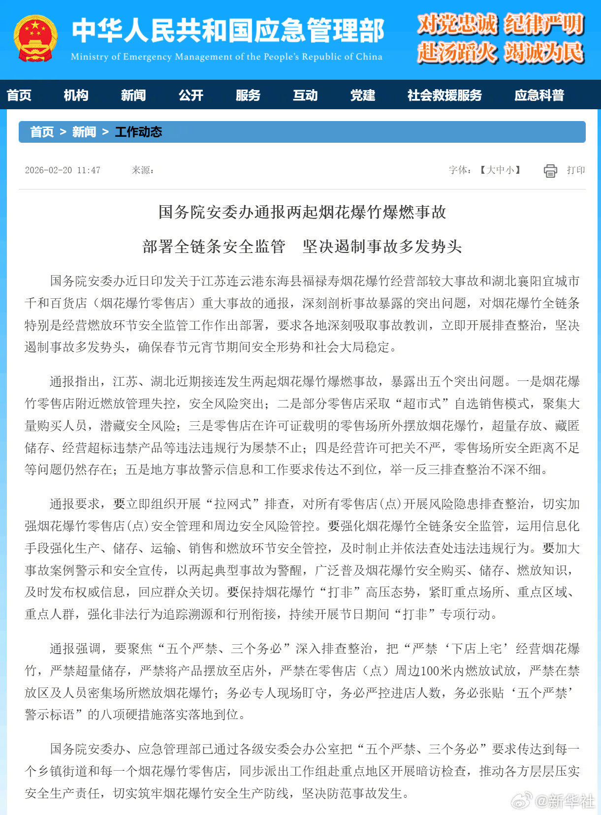 国务院安委办、应急管理部已通过各级安委会办公室把“五个严禁、三个务必”要求传达到每一个乡镇街道和每一个烟花爆竹零售店,同步派出工作组赴重点地区开展暗访检查,推动各方层层压实安全生产责任,切实筑牢烟花爆竹安全生产防线,坚决防范事故发生。(新华社)