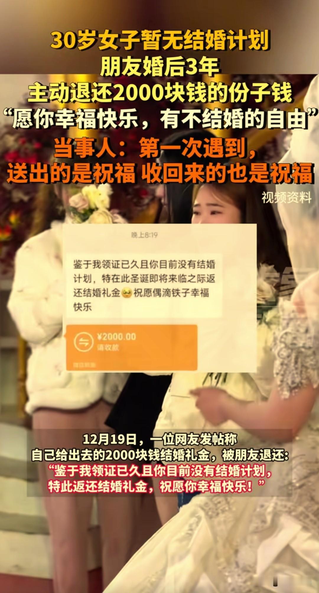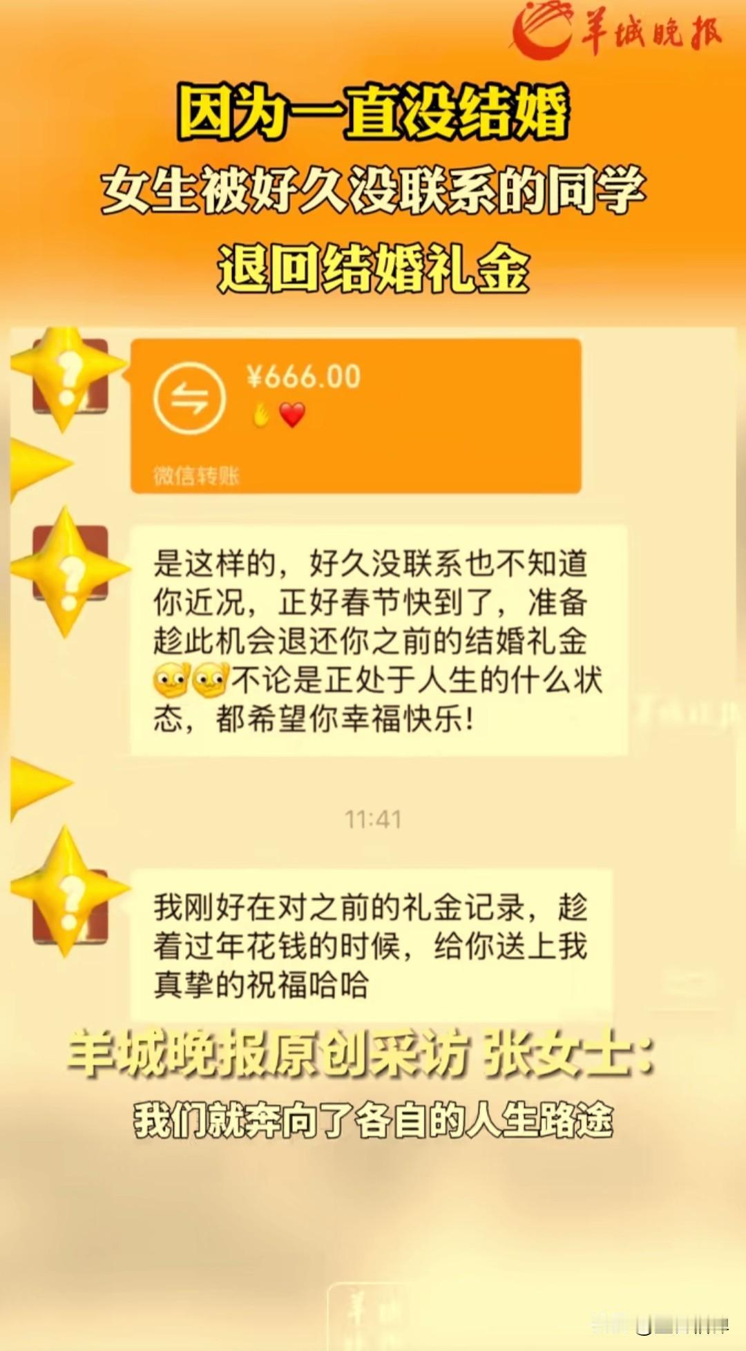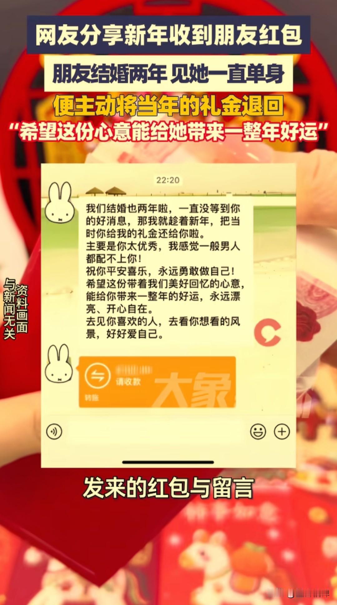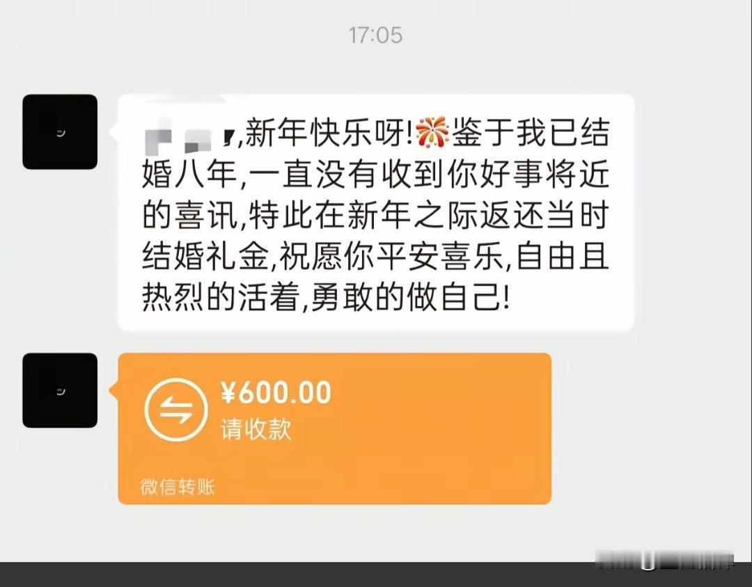 大年初一,01年女生cici收到一份特别的新年惊喜,竟然是四年前随出去的份子钱 她四五年没联系的大学实习好友,突然发来红包和一段话:“我们结婚也两年啦,一直没等到你的好消息,那我就趁着新年,把当时你给我的礼金还给你啦。” 朋友还暖心地写道:“你太优秀,一般男人都配不上你。祝你平安喜乐,永远勇敢做自己,去见喜欢的人,看想看的风景,好好爱自己。” cici说,这是她新年收到的第一份惊喜,没想到这份随礼会以这样的方式回来。 她们两人在大学实习时相识,共事了大概半年时间,毕业后四五年没怎么见面,几乎没有联系,聊天记录也停留在朋友结婚时cici随礼的那一刻。 网友看到后,说如果我的朋友们都这么懂事,那我得收到多少退还的礼金,纷纷在短视频上发起了截图玩起了梗。 其实我们身边,这样的“份子钱尴尬”并不少见: 有的辞职离开了、有的去了别的城市,曾经要好的同事、同学渐渐断了联系。 结婚时碍于情面随了礼,之后却再也没见过面,更别说等到“回礼”的那天。份子钱成了人情债,压在彼此之间,连一句问候都变得小心翼翼。 本人在外二十年,也在不同的公司工作过,也辗转去了好几个城市,包出去的礼金不少了,换了工作和地方就很少联系了,到现在一个都没有收回来。 有人说,份子钱是成年人社交的照妖镜。但在这个故事里,我们看到了另一种可能: 不把人情当负担,不把随礼当交易,用一份体面的退回,守住了最纯粹的友谊。 这样的朋友,才值得我们用一生去珍惜。