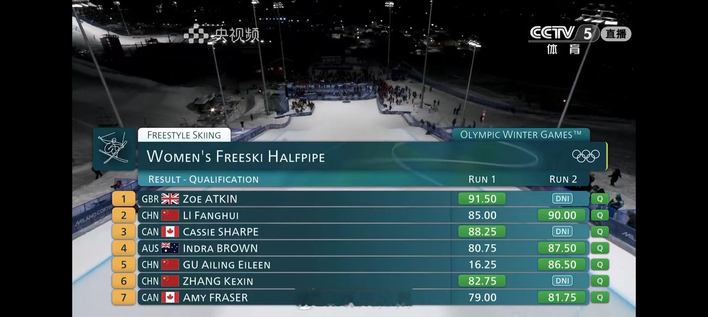 2026年米兰科尔蒂纳冬奥会 自由式滑雪女子U型场地技巧资格赛1.🇬🇧佐伊·阿特金91.50分 Q2.🇨🇳李方慧90.00分 Q3.🇨🇦夏普88.25分 Q4.🇦🇺因德拉·布朗87.50分 Q5.🇨🇳谷爱凌86.50分 Q6.🇨🇳张可欣82.75分 Q7.🇨🇦埃米·弗雷泽81.75分 Q8.🇺🇸斯韦亚·欧文80.75分 Q9.🇨🇦卡克尔78.25分 Q10.🇳🇿米沙·托马斯77.00分 Q11.🇨🇳刘奕杉76.00分 Q12.🇺🇸格雷74.75分 Q资格赛前12名晋级决赛谷爱凌晋级U型场地决赛谷爱凌第二滑86.50分