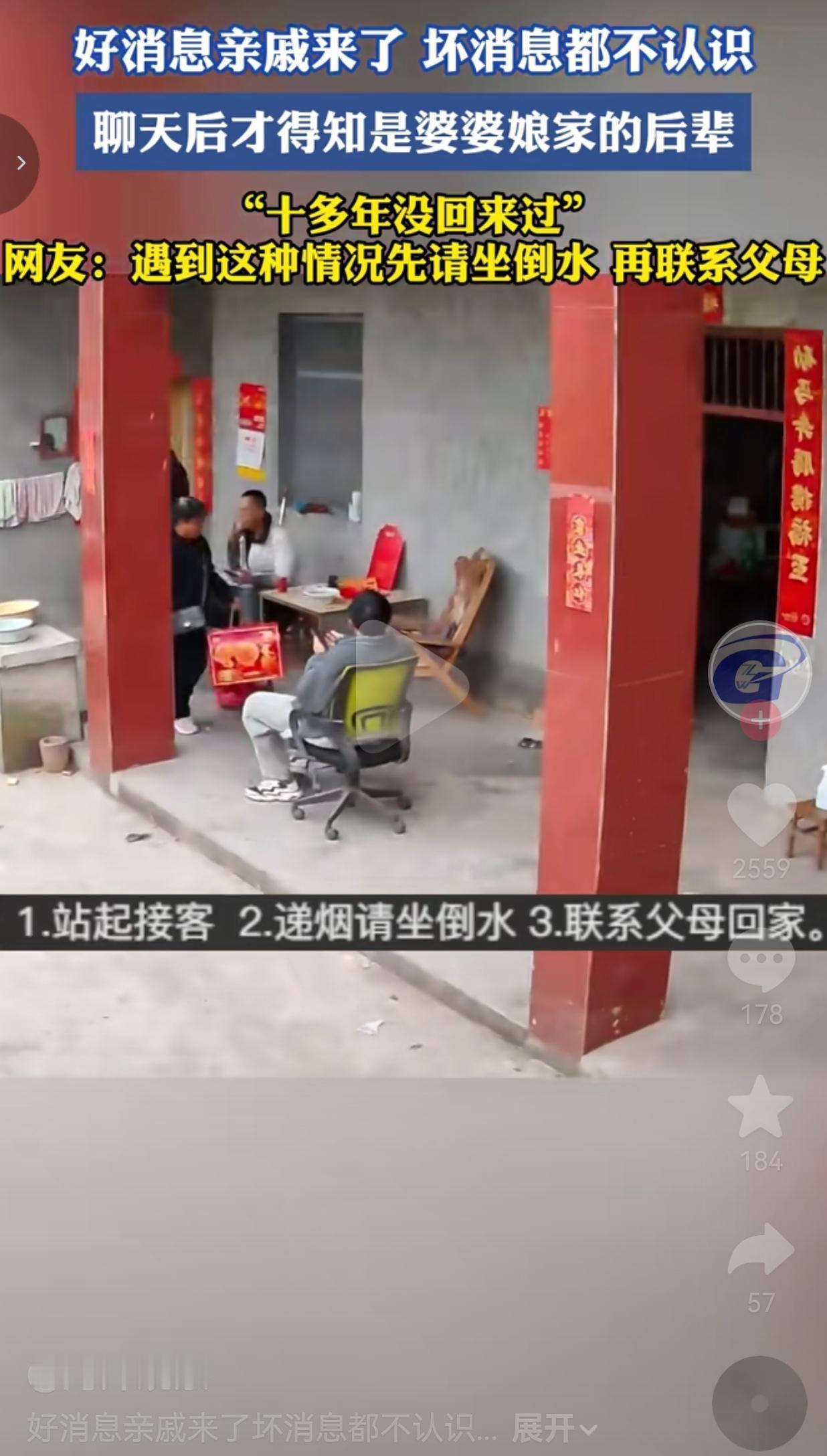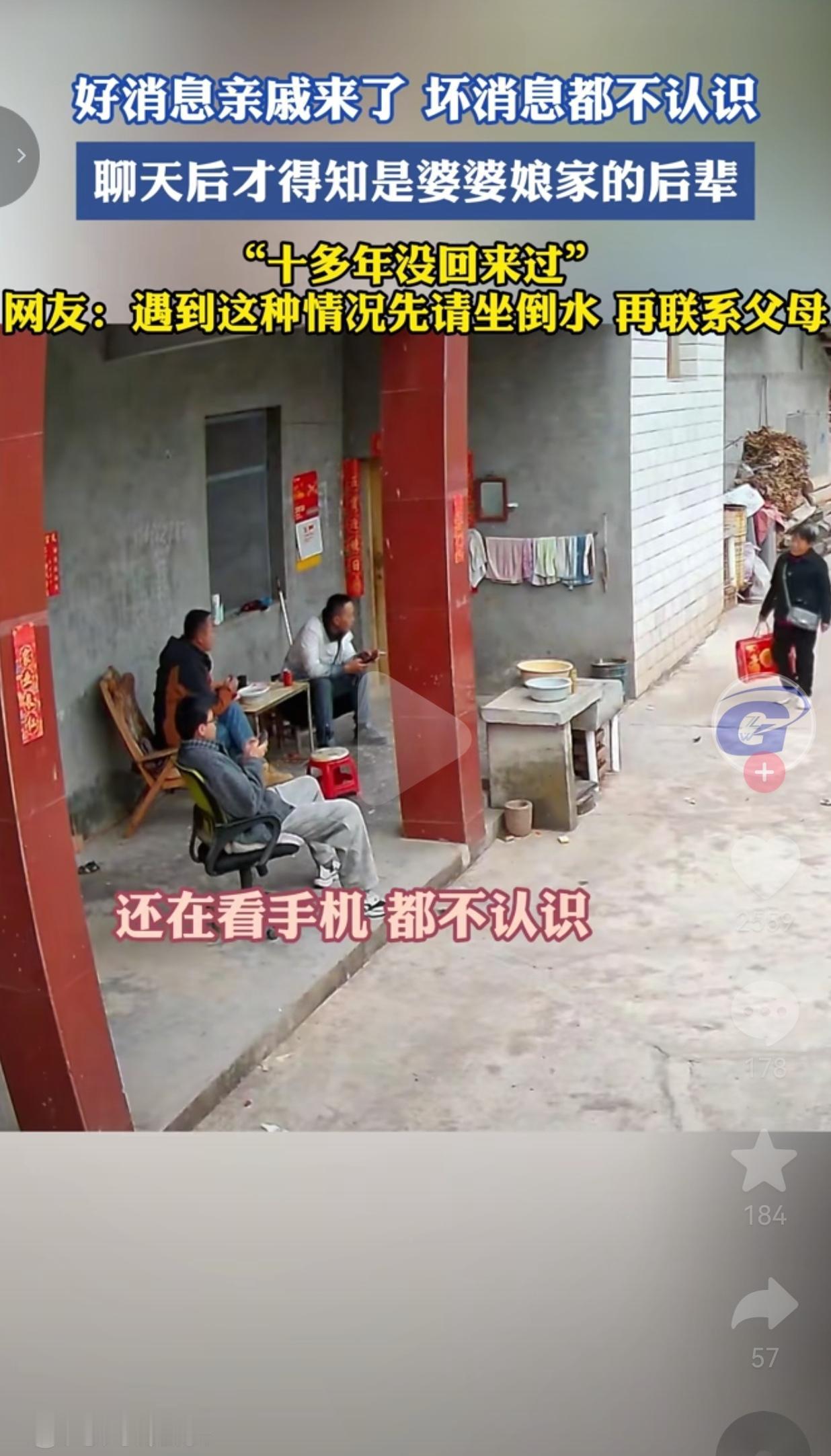 这也太尴尬了!2月19日,四川一户人家的监控,把春节里最真实又有点尴尬的一幕拍了下来。 那天,家里几个年轻人正瘫在院子里刷手机、闲聊,突然看见一对拎着礼品的男女走进来。 大家听到脚步声后,都面面相觑,谁也不认识,心里直犯嘀咕:“这谁啊?不会是走错门了吧?” 一开始,他们还以为是问路的,直到对方开口,才知道是婆婆娘家的后辈,因为十多年没回来过,大家早就认不出彼此了。 网友们看完视频,一边笑一边支招:“遇到这种情况,先请坐倒水,再赶紧给爸妈打电话!” 说实话,我看完这段视频,心里挺不是滋味的。 小时候过年,一大家子挤在老屋里,七大姑八大姨的名字我倒背如流,哪家孩子考了多少分、谁家又添了新家具,门儿清。那时候的亲戚,是真的“亲”,是逢年过节必走动、遇事必搭手的人。 可现在呢?我们长大了,去了更远的城市,有了新的生活圈,和老家的亲戚慢慢断了联系。别说十多年没见的远房后辈,就算是亲堂兄妹,一年到头也说不上几句话。 视频里的年轻人,不是不懂礼貌,而是真的“认不出”了。他们低头刷手机的样子,像极了我们自己——明明坐在亲戚堆里,却像个局外人,只能靠手机掩饰尴尬。 有人说,这是人情淡薄的表现。可我觉得,这更像是时代的无奈。我们被生活推着往前跑,忙着赚钱、忙着养娃、忙着应付各种KPI,连回一趟老家都要掐着时间,哪还有精力去维系那些“远得看不见”的亲戚关系? 但反过来想,那些被我们渐渐遗忘的亲戚,其实一直都在惦记着我们。就像视频里的这对后辈,带着礼品、跨越十多年的时光回来,不就是想续上那点血脉里的情分吗? 我们总说“人情世故”太复杂,可最朴素的人情,其实就是“你来了,我就好好待你”。哪怕认不出,先递杯热茶、搬个凳子,再给爸妈打个电话确认一下,这不是客套,是刻在骨子里的教养。 大家觉得呢?欢迎评论区唠唠。