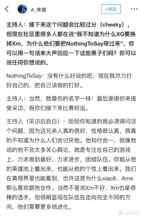 昨天主持人在赛后采访莫言的时候这个问题真的很尖锐,他让莫言回应那些让换回XM的黑子,莫言说没什么好说的,现在尽力打好自己的dota2