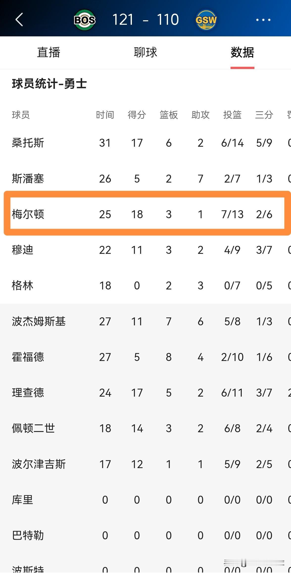 勇士大将梅尔顿真是虽败犹荣!虽然今天勇士在主场以110:121不敌凯尔特人,但是梅尔顿却打出了无可争议的表现,属于典型的虽败犹荣。 全场比赛下来,梅尔顿首发出战25分钟,投篮13中7,其中三分球6中2、罚球4中2得到18分,还有3篮板1抢断。 实事求是的说,本场比赛梅尔顿绝对是勇士阵中表现最好的球员之一,可惜的是球队依然输掉了比赛。