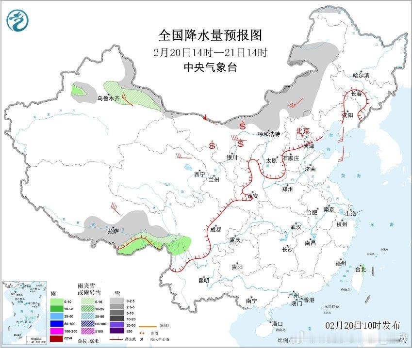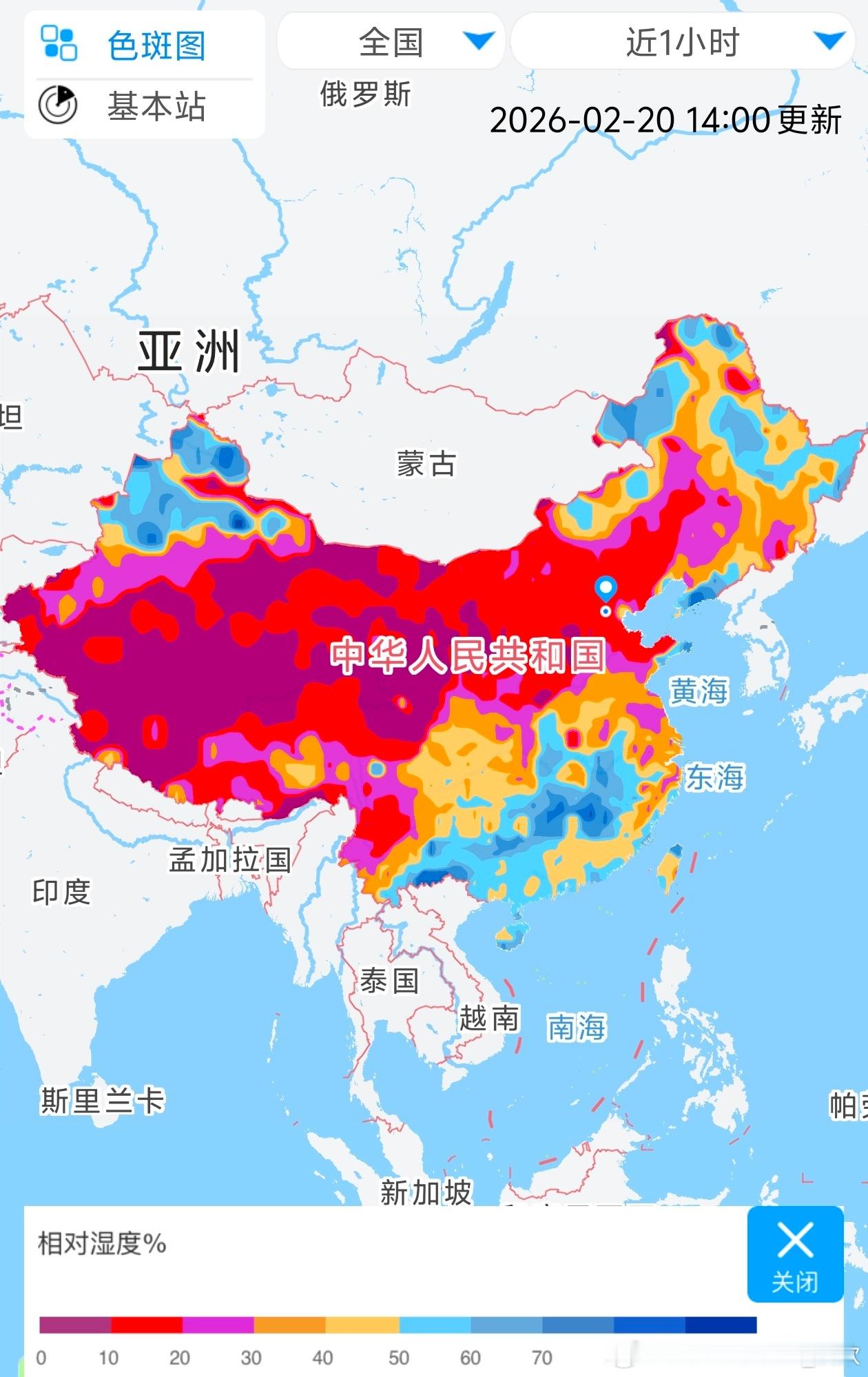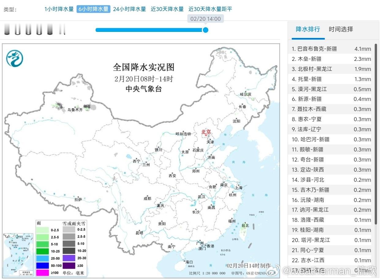 【晴 暖 干】今天我国万里无云,晴朗升温、温暖干燥,是主流天气。部分时次,单小时降水量达到0.1毫米站点,凑不齐10个。今天08-14时降雪零散出现在新疆黑龙江的部分地区。巴音布鲁克降雪量4.1毫米,为最强。今天下午到明天中午,内蒙古中东部和西藏东部雨雪增多,新一轮雨雪过程初露端倪。