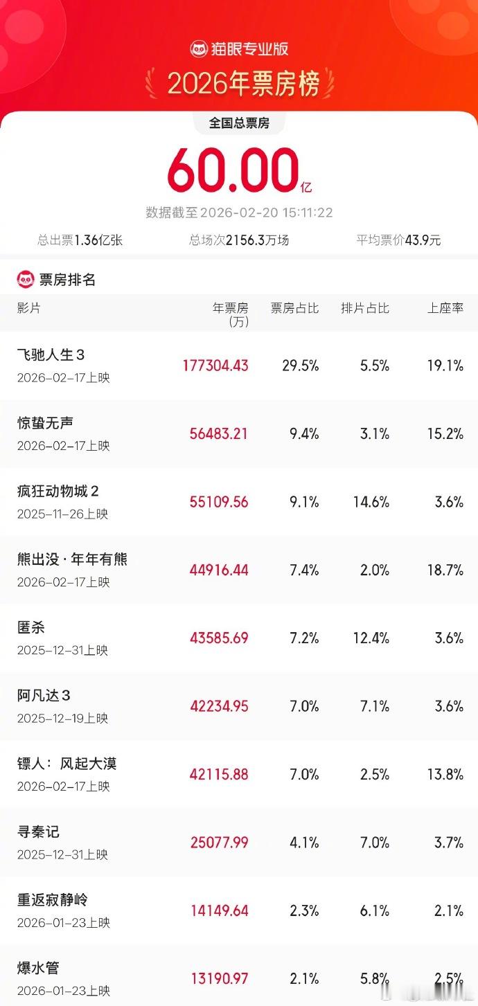 2026电影总票房破60亿 据网络平台数据,2026年年度总票房(含预售)突破60亿元!《飞驰人生3》《惊蛰无声》《疯狂动物城2》暂列年度票房榜前3位。