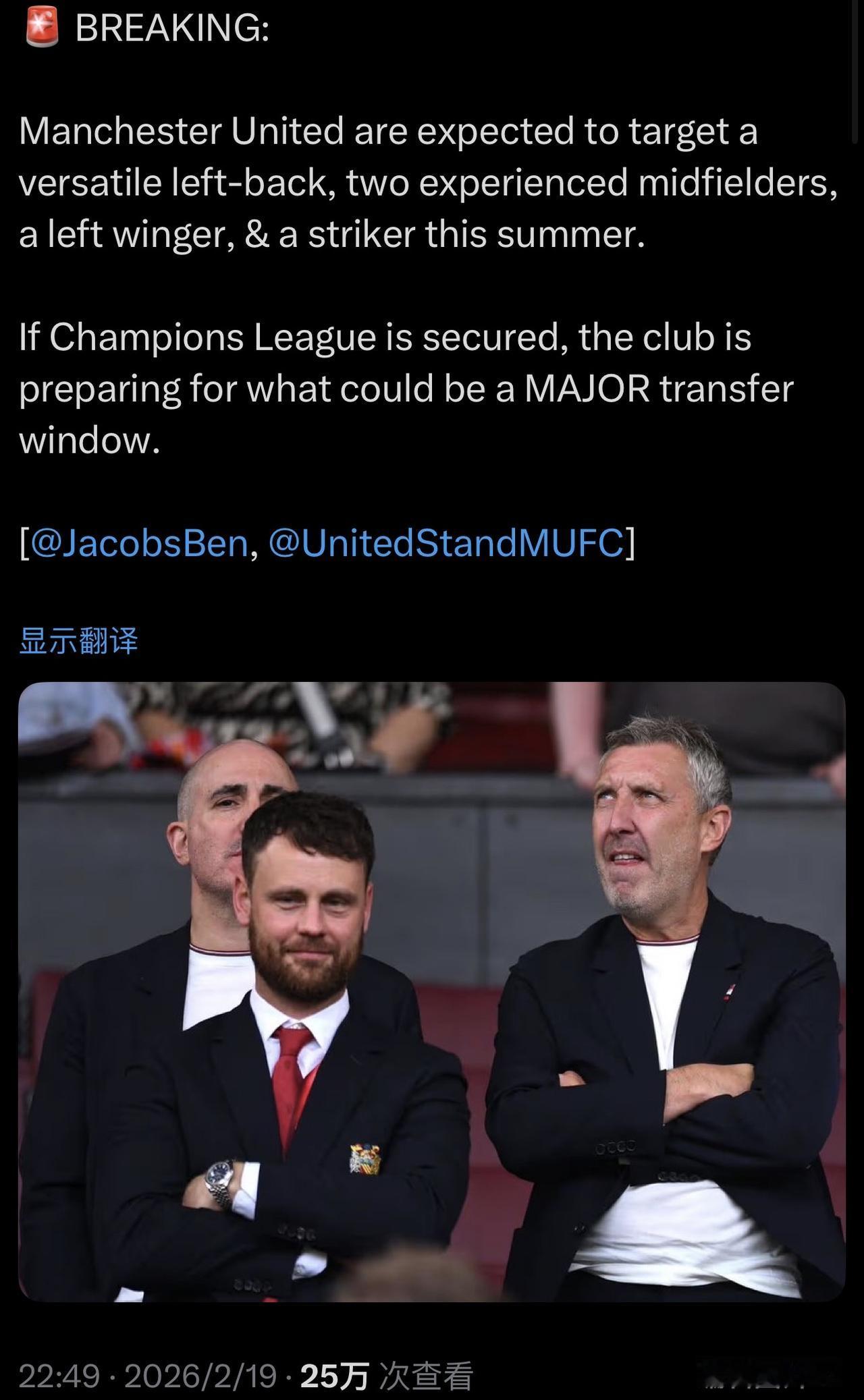 还有2个替补门将! 曼联现在,除了右路和中卫不用买,其他位置都需要补充。 所以曼联该买谁,根本没什么意思,因为曼联根本不可能一个夏天买那么多人[捂脸] ……………………………………………………………… 预计曼联今夏的目标是引进一名多面手左后卫、两名经验丰富的中场球员、一名左边锋和一名前锋。 如果能够确保获得欧冠资格,俱乐部正在为可能到来的一次重大转会窗口做准备。