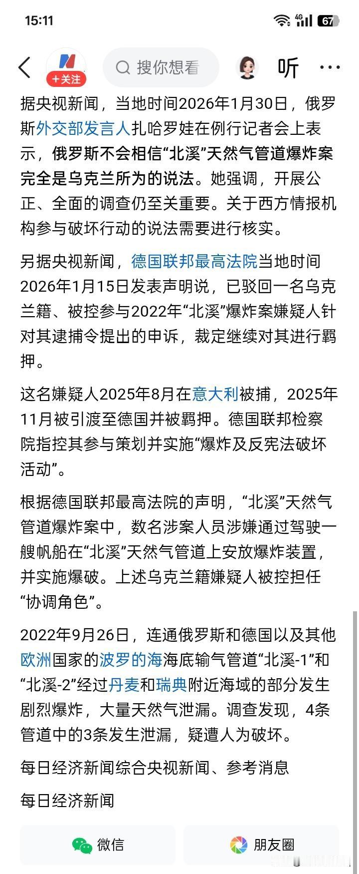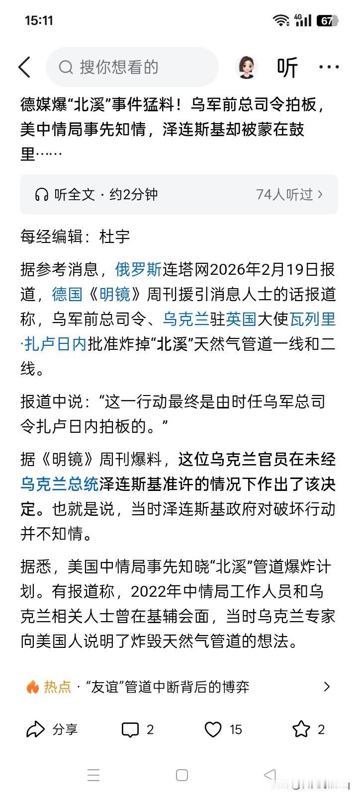 目的在哪? 最新这个消息令人摸不透大头小脑,既不知道真假,也不清楚究竟是要表示个什么意思或目的。 说的是2022年“北溪”一线、二线输气管道被在海底爆炸的案件,德国媒体《明镜》周刊获得内部信息说,是当时的乌克兰武装部队总司令、现任乌克兰驻英国大使扎卢日内批准、或许还亲自组织了对“北溪”输气管道的爆炸破坏工作,而乌克兰总统泽连斯基对此事先并不知情,但乌克兰专家偏偏向美国中央情报局官员透露爆炸“北溪”天然气管道的设想。 爆炸“北溪”天然气输气管道,当时是一件举世瞩目的大事件,但当时的舆论普遍认为,乌克兰一个国家做不了这样的爆炸行动。如果真的是乌克兰一个国家的人做的事情,泽连斯基有可能是事先不知道。但假如还有另外国家参与,却说泽连斯基事先不知道,就有点不可思议了。 俄罗斯方面并不认可“北溪”天然气管道是乌克兰一个国家制造的说法,好像认为一定有外国情报机构参与其中。 不过,无论如何,这都是战争的附带品,最多也不过就是战争行为。