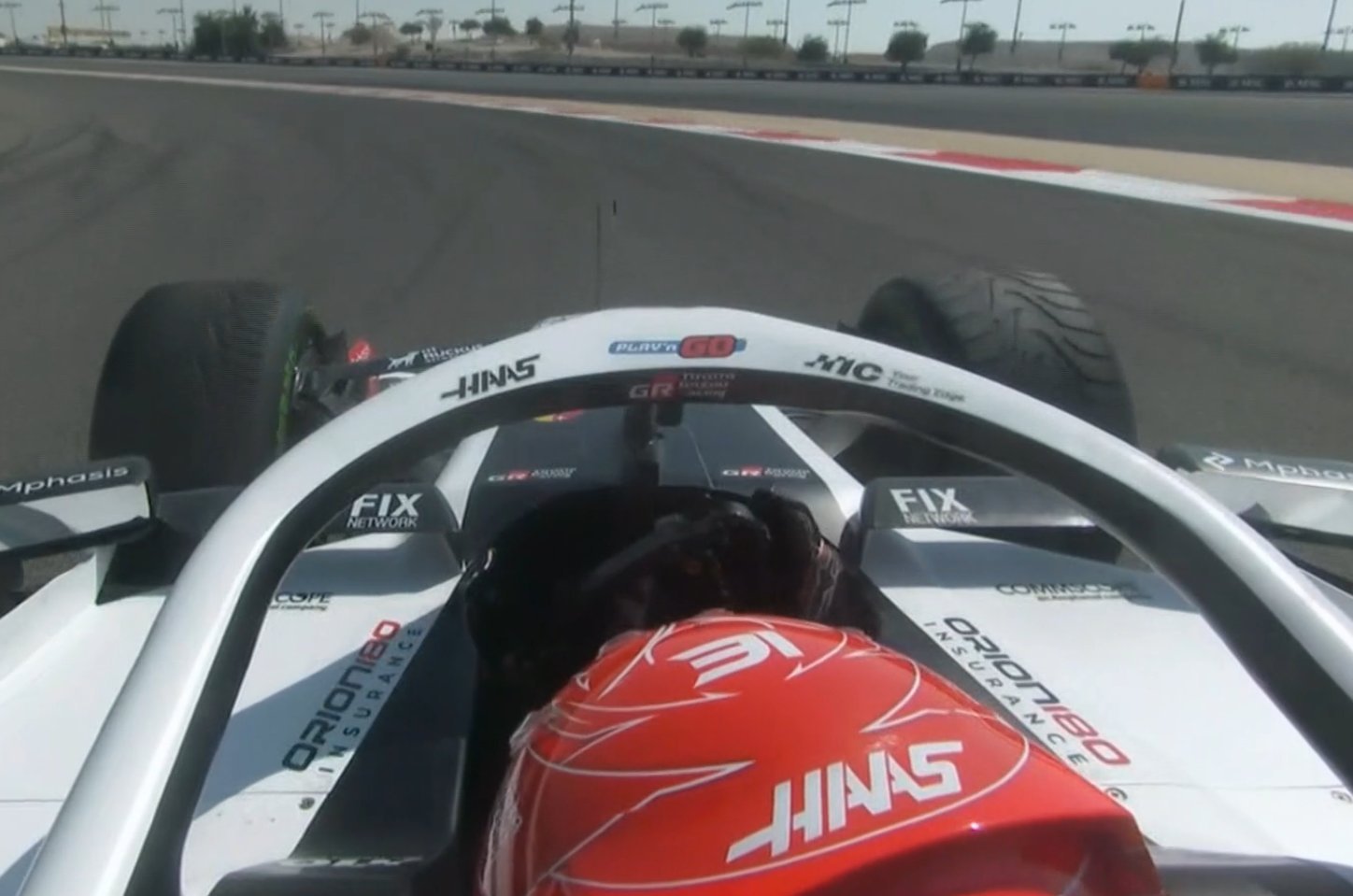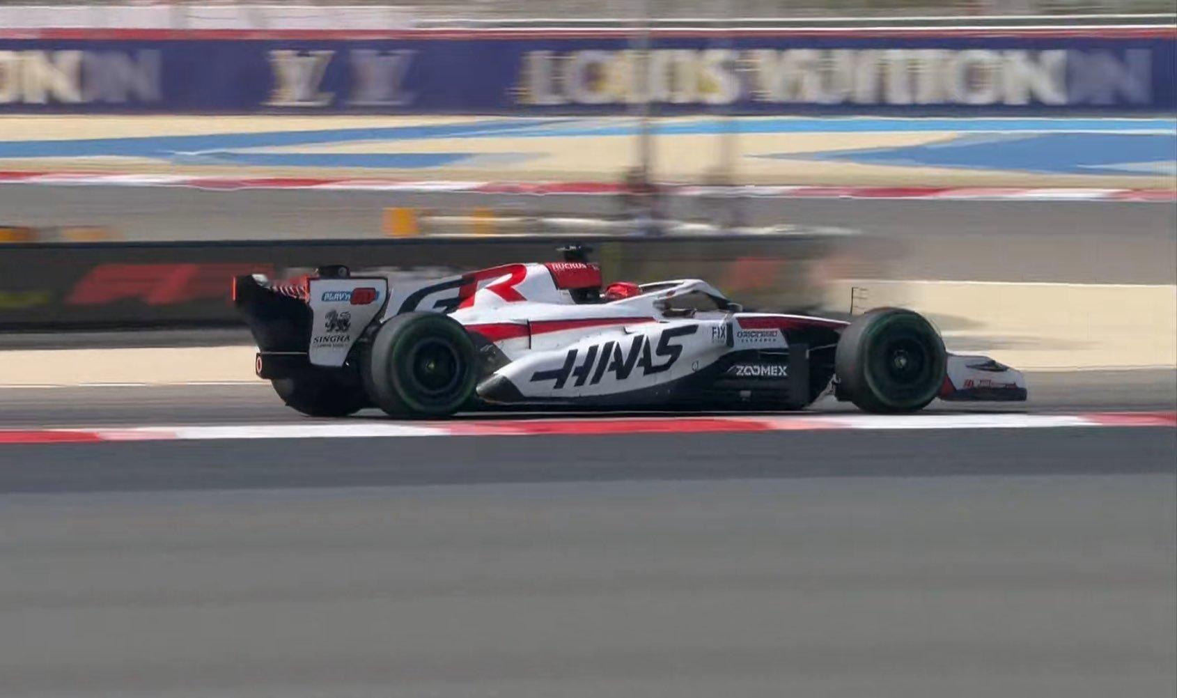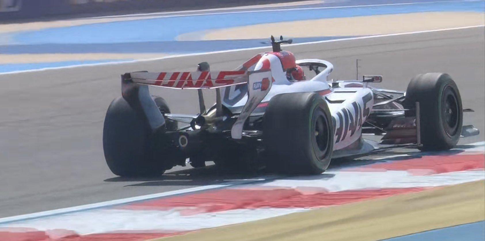 哈斯车队……额,我要没看错的话 这是半雨胎吧(测试雨天直道模式~只打开前鼻翼F1赛车2026F1季前测试