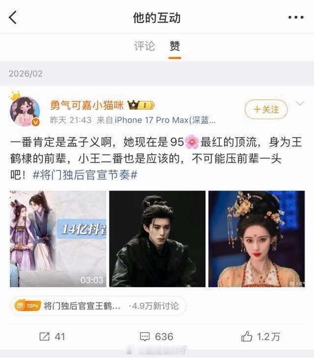 将门独后导演尹涛点赞了支持孟子义一番,王鹤棣二番的微博,手滑了这是……