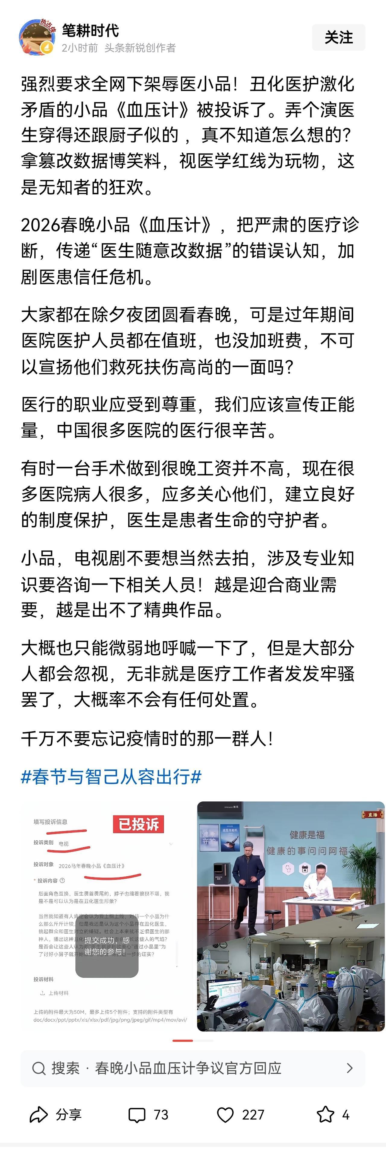 对春晚《血压计》节目刻画的医生形象,有医生认为这缺乏对医生职业的基本尊重,连体检报告不能修改的医学常识都没有。这其实已经是老问题了,为了制造笑料,有些节目完全脱离现实,比如多年前春晚节目称上大学没学费需要捐款,而当时早已经有国家助学贷款以及其他帮困措施,并不存在没有钱就不能上大学的问题。应该利用这一平台宣传政策,而不是为节目需要误导观众。