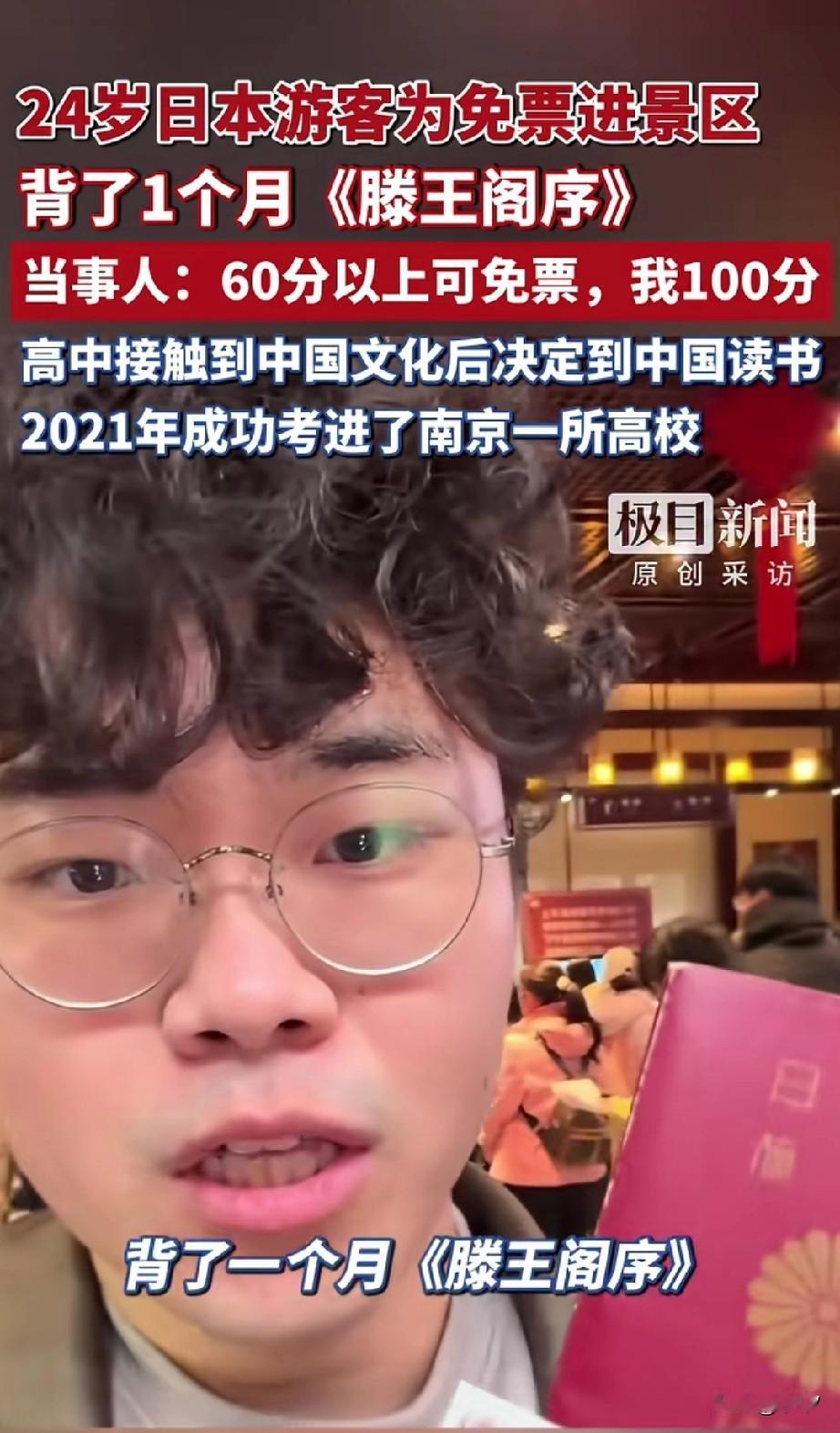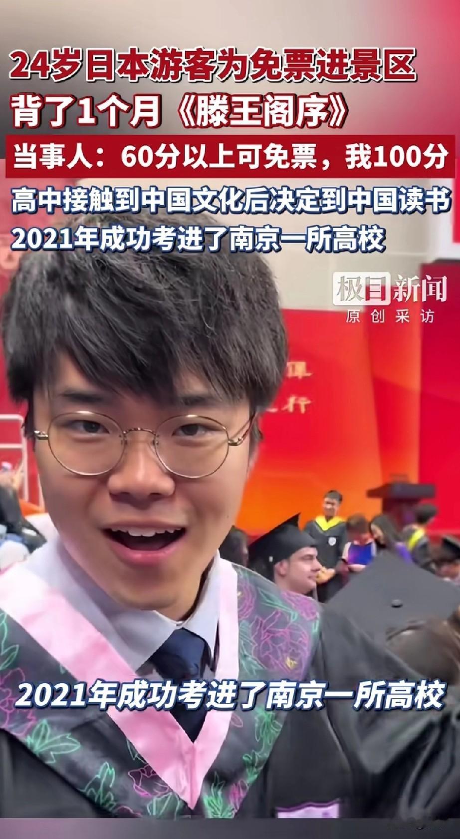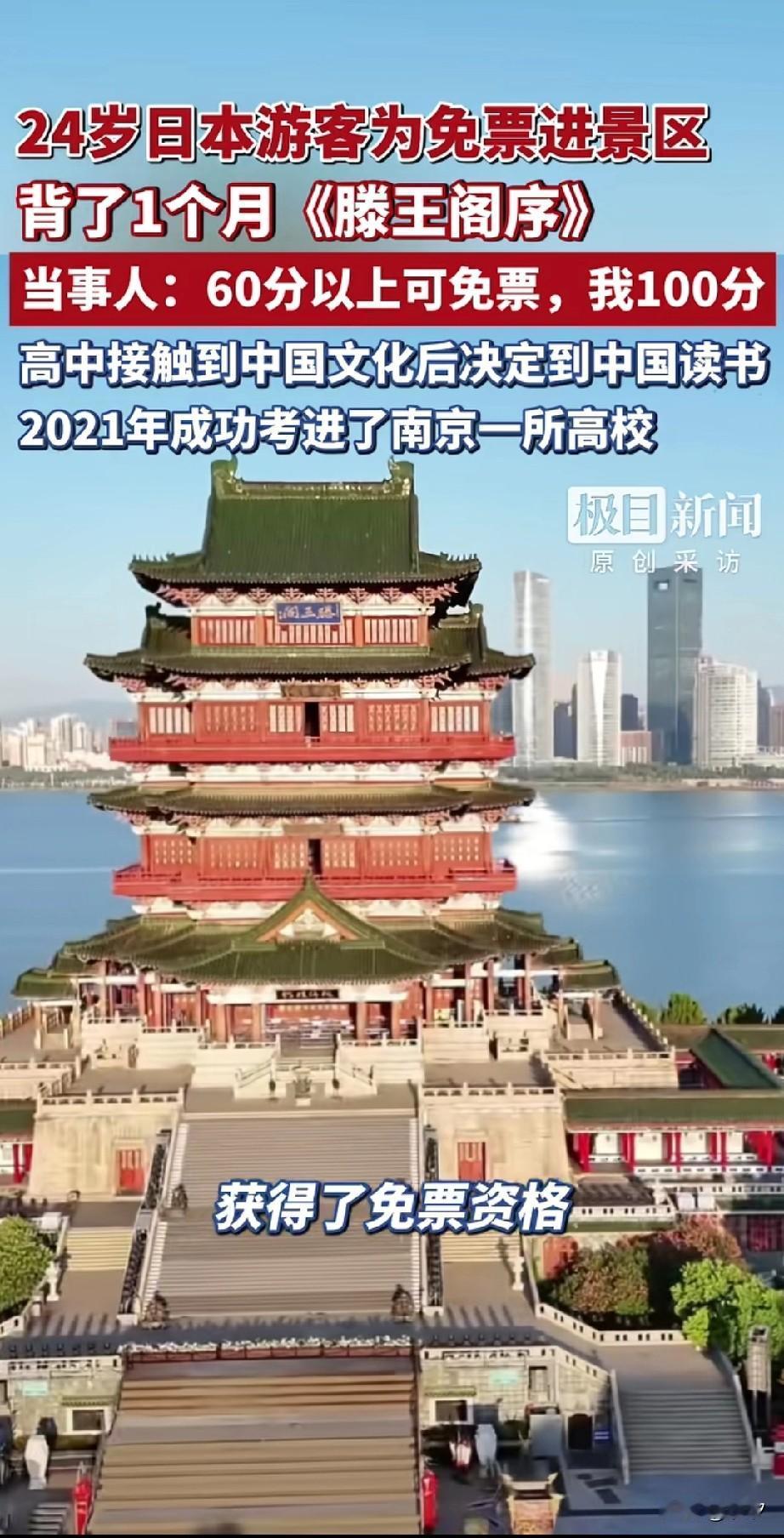24岁的日本游客背滕王阁序, 可以免费的进入滕王阁参观, 工作人员还以为他是中国人, 结果对方是日本, 他由于高中时期接受到中国文化, 非常的喜欢, 居然还考入了中国南京的重点大学, 他非常自豪的给他的粉丝炫耀, 只要60分就可以免费进入, 但是我得了100分, 自豪感油然而生, 大家都知道南京做过很多朝代的都城, 滕王阁是当地的有名景点, 日本学生去参观滕王阁, 这是对文化的热爱, 这事一经曝光迅速登上了热搜, 毕竟南京和日本的关系非常的微妙, 历史上这座城市经历了很大的灾难, 许多的无辜老百姓受到了伤害, 铭记历史,才能走得更远! 大家对于日本游客免费进入滕王阁序这事怎么看? 南京 滕王阁
