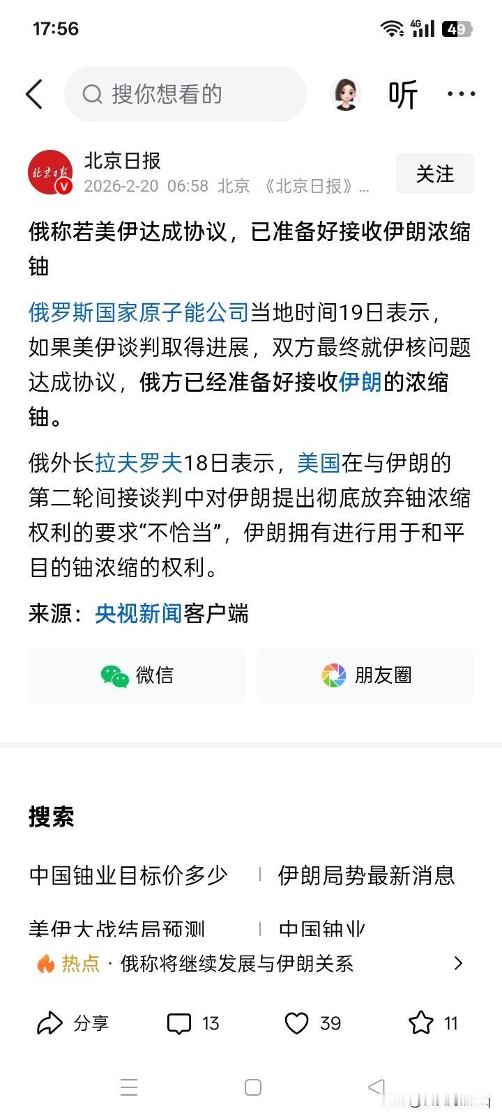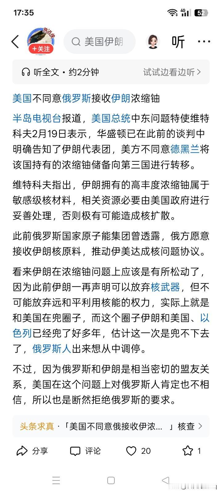 预料之中的事情! 俄罗斯好像磨拳擦掌,随时准备接收伊朗的浓缩铀。其实,以美国总统特朗普的性格,他怎么可能让俄罗斯保管或以它方式接收伊朗的浓缩铀呢!这件事情完全就是俄罗斯方面的一厢情愿,自我感觉。 而且,实际上好像伊朗也没有正式的官方表示,要将浓缩铀交给俄罗斯。俄罗斯与伊朗,好像都是心比天高的国家,虽然有许多的合作,但无疑也有矛盾,甚至是互相防备。 如果还不明白,看看伊朗精神领袖哈梅内伊,曾经在伊朗会见俄罗斯总统普京的照片就清晰可见。 特别是,可能的几百公里的浓缩铀,也是一笔巨大的财富,无论美国与伊朗的谈判结果如何,估计特朗普都万万不会同意伊朗将浓缩铀交给俄罗斯的。