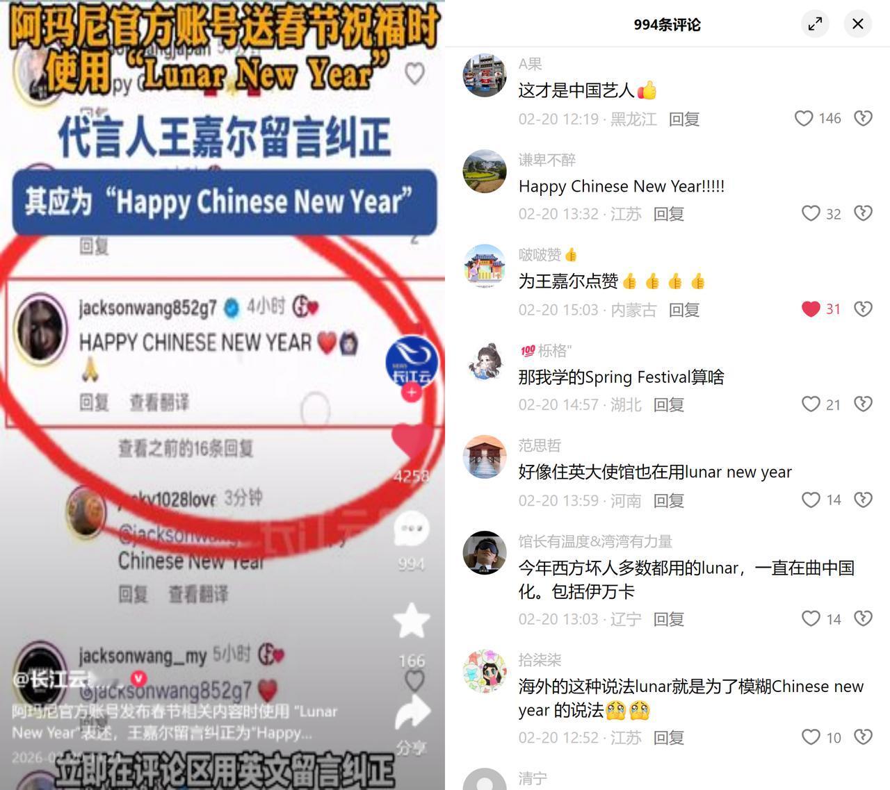 王嘉尔硬刚阿玛尼! 阿玛尼外网发马年春节祝福,用了Lunar New Year。 王嘉尔直接留言纠正成HAPPY CHINESE NEW YEAR,粉丝也跟着在留言里力挺。 这哪是临时起意的硬刚?这是他刻在骨子里的立场! 2019年他敢当护旗手,哪怕被乱港势力攻击、丢市场也不退缩;2023年伦敦演唱会,直接用英文怼外媒抹黑,喊着“我来自中国,来这里看看就知道有多棒”。 现在西方品牌把去中国化当潜规则,用Lunar模糊春节的中国归属,王嘉尔就是从文案细节里硬刚的反模糊武器! 别再说Lunar也没错,这背后就是想把中国春节的根给抹掉,换成无主的农历新年。 这种从护旗手到文化捍卫者的坚持,才是中国艺人该有的样子! 试问谁看到这样的他,能不竖大拇指?