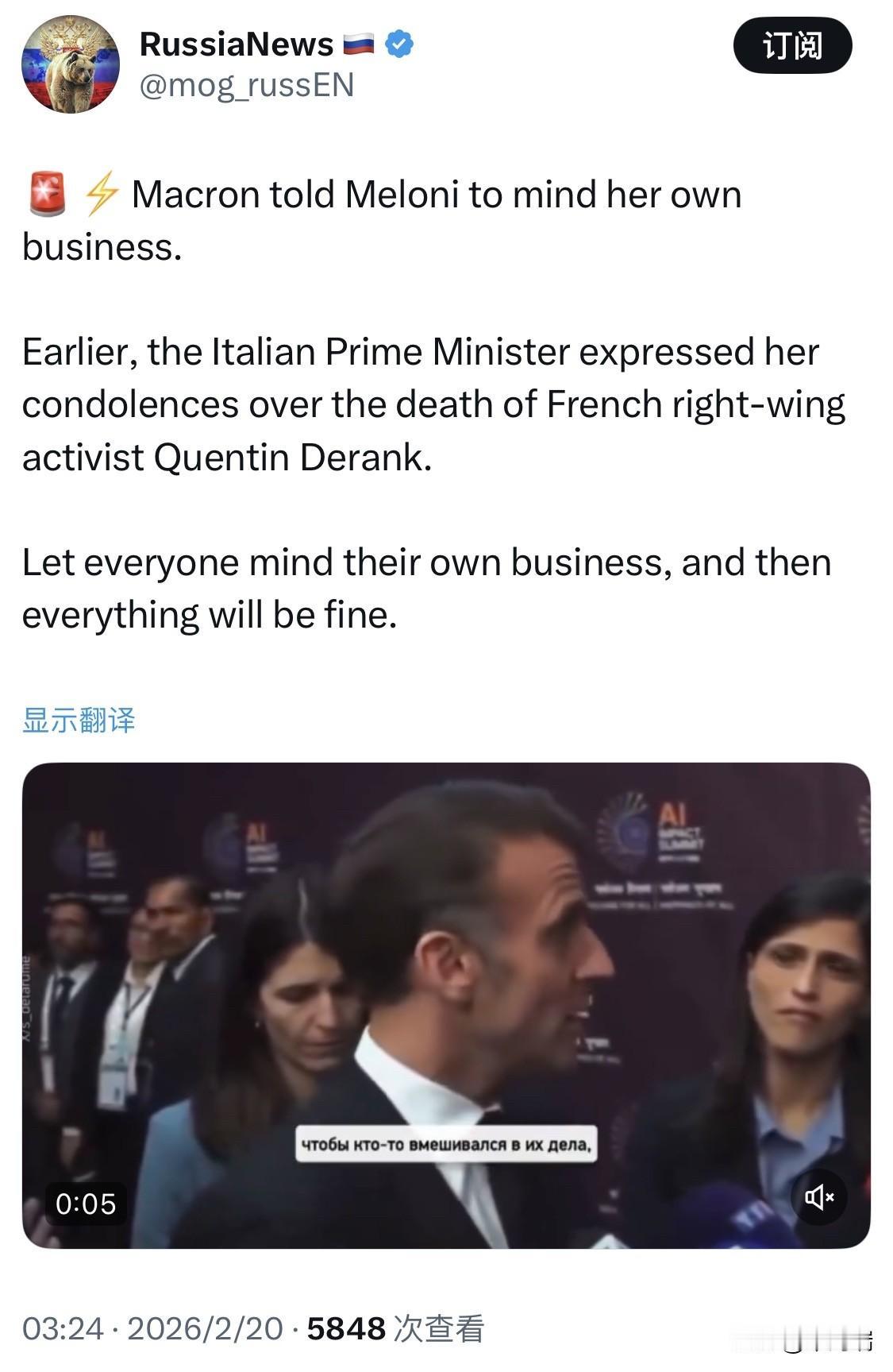 2026年2月19日,法国总统马克龙与意大利总理梅洛尼因一名法国极右翼活动家昆汀·德兰克(Quentin Deranque)之死爆发了激烈的口水战。 以下是事件的具体经过: 事件起因:23岁的德兰克上周在里昂的一场极右翼抗议活动中被多人殴打,因头部重伤不治身亡。目前已有11人被拘留,其中多数嫌疑人来自极左翼团体。 梅洛尼的哀悼:梅洛尼随后在社交媒体上发文,称这起事件是“全欧洲的伤口”,并谴责这是一种由“意识形态仇恨”引发的暴力行为。 马克龙的回击:正在印度访问的马克龙对此反应强硬。他直接点名梅洛尼,要求她停止“评论发生在别国的事情”,并讽刺地表示:“让大家都待在各自的领地里(Let everyone stay in their own lane),把自己的羊看好,一切都会好起来的”。 意方反应:意大利总理府对此表示“震惊”,强调梅洛尼的表态只是表达对法国人民的同情,并未干涉内政。 这次摩擦再次凸显了这两位欧洲领导人之间长期以来的紧张关系。