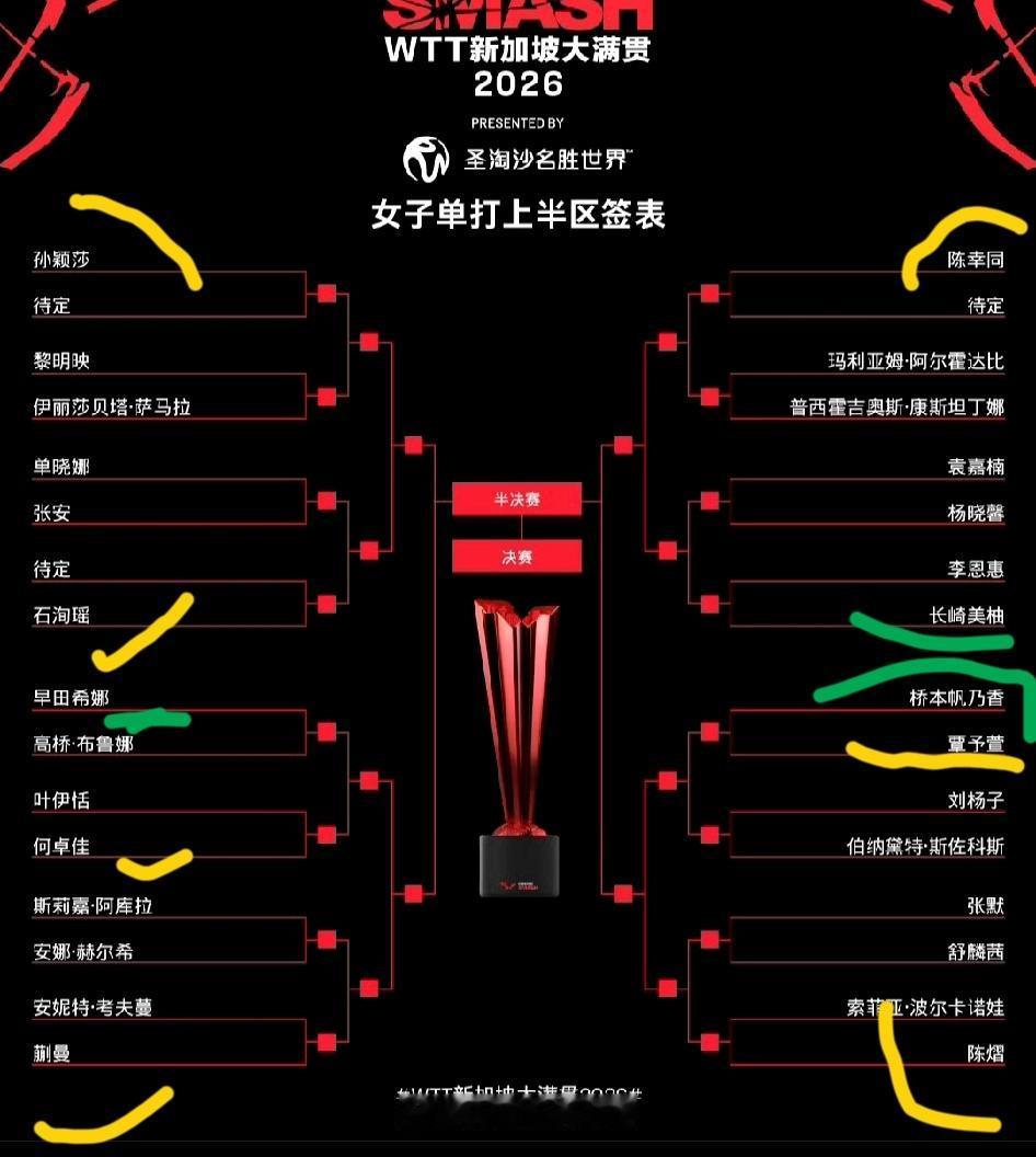 【2026wtt新加坡大满贯】 2月20日,签位新鲜出炉 莎莎的上半区,热闹非凡 覃予萱首轮对阵桥本帆奶香! 目前,小蘑菇还没有赢过她 首先自己人就有7个 莎莎,石洵瑶,佳佳,小曼姐 在1/4区,也就是说, 她们中只有一人能进四强 陈熠、同同、小蘑菇在2/4区 而且,小蘑菇首轮对阵桥本 如果小蘑菇失守,那么有可能 陈熠再次相遇桥本 同同、陈熠,小蘑菇 也是只能有一个晋级4强 佳佳有可能对上早田希娜 总之,都是硬仗 曼昱的下半区,国乒占了两位 大迪在3/4区 强敌有伊藤和朱雨玲 曼昱在4/4区, 有可能和申裕斌 美和或大藤沙月遇到 统统都是硬仗,都支棱起来,先把外战打好,然后再说内战!千万不能老研究自己人,一打外协就懵圈! 莎莎宝贝健康完赛,比赛顺利[比心] 晒图笔记大赛 乒乓球