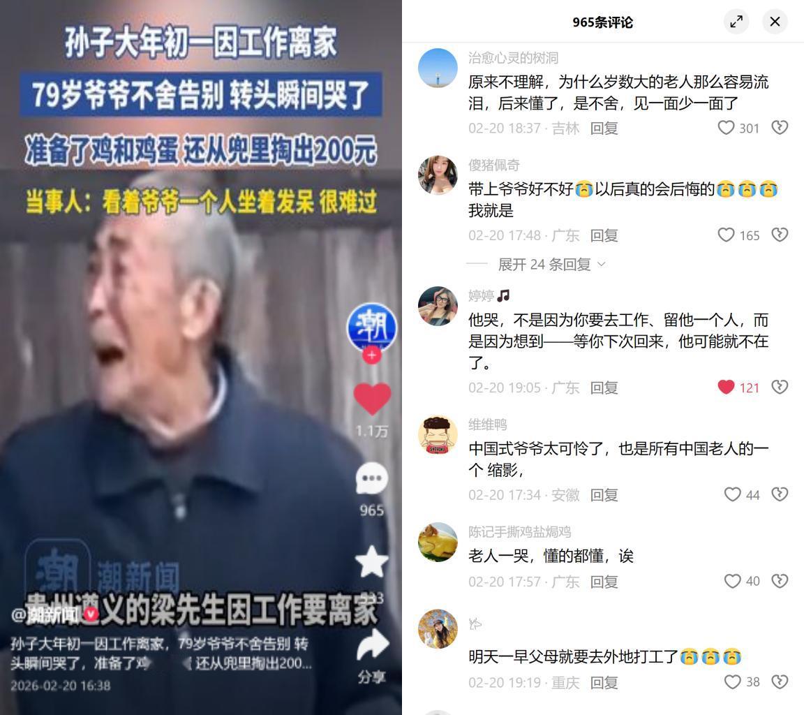 大年初一返工,爷爷哭红眼塞钱 贵州遵义的梁先生,大年初一就得离家返工。79岁独居的爷爷,塞给他鸡、鸡蛋和攥皱的200块,转头就抹起了泪,送完人独自坐在门槛上发呆。梁先生说上次回家还是两年前,看着爷爷背影特别难受。 谁不是这样啊?总把等赚了钱就陪你挂嘴边,可爷爷的时间哪等得起?那200块说不定是他省吃俭用攒的,攥得皱巴巴的,比我们银行卡里的数字都金贵! 现在的人,个个把工作排在团圆前面,张口闭口以后再说。可对79岁的老人来说,以后到底还有多少个?有人说带爷爷一起走,道理谁都懂,可房贷房租、通勤加班,哪能说走就走? 可看着爷爷哭红的眼尾、后颈的白发,又忍不住反问:到底是钱重要,还是当下的陪伴重要?别等子欲养而亲不待才捶胸顿足,有空就多回趟家吧!