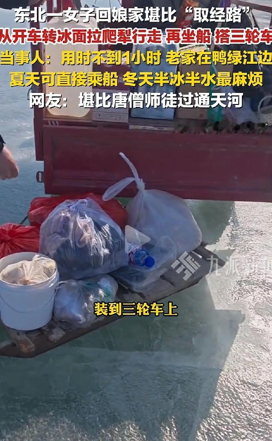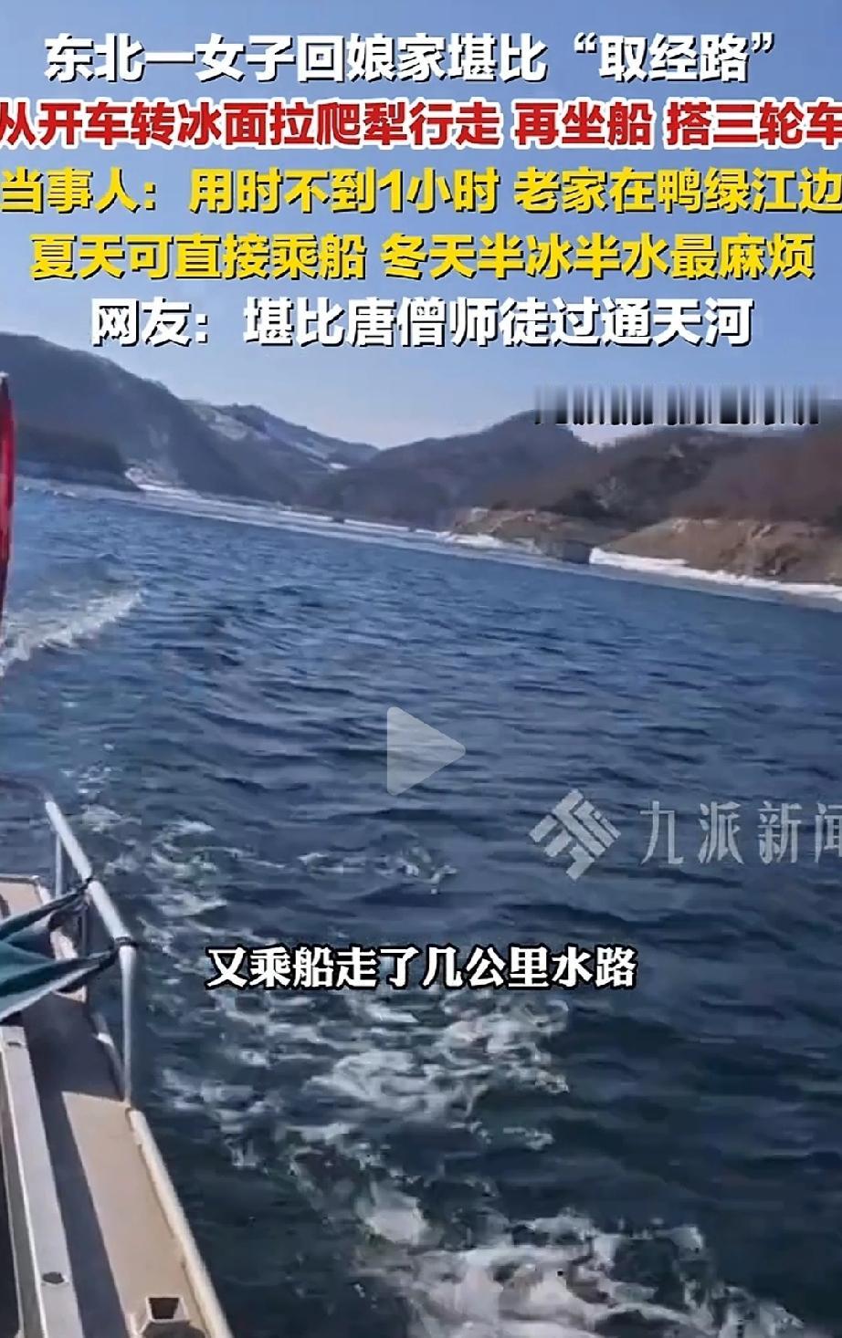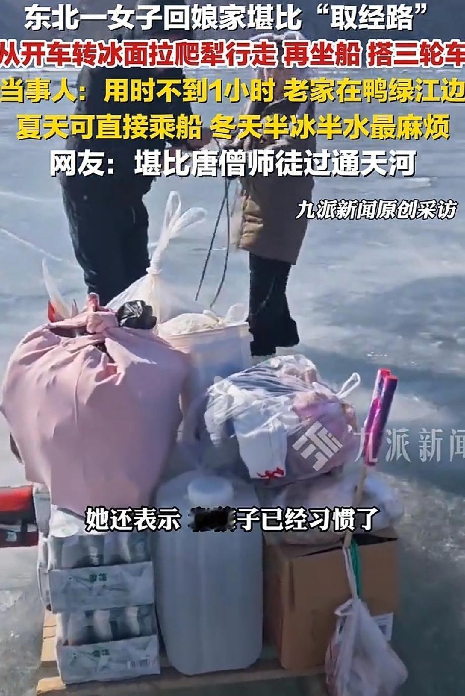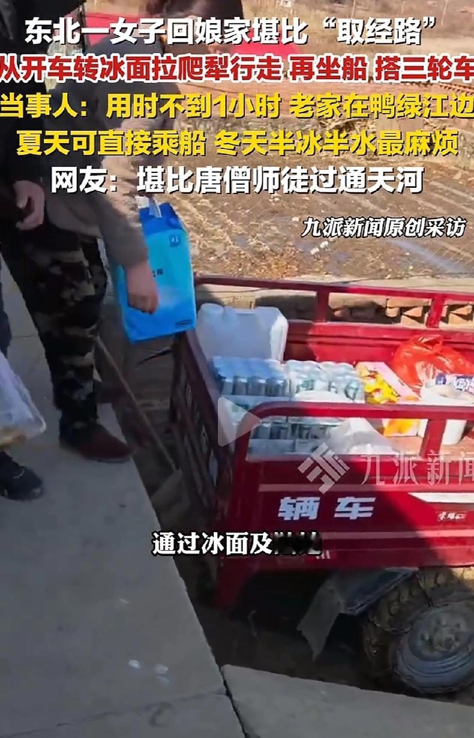辽宁丹东,任女士大年初二回娘家,短短四五公里直线距离,先后换了汽车、爬犁、船、三轮车四种交通工具,1小时才到家。网友调侃这趟路堪比唐僧师徒过通天河! 任女士的老家在鸭绿江江边,平时回娘家主要走水路,夏天能直接坐船,挺方便的。可到了冬天就麻烦了,江面半冰半水,是最难走的时候。 大年初二这天,任女士带着孩子回娘家拜年,汽车只能开到离家四五公里的地方,再往前就走不了了。 接下来的路,可真是“步步换装备”:先坐上爬犁,在四五百米的冰面上滑行;冰面走完,又换乘船,在江面上走了几公里;下了船还没完,再换爬犁和三轮车,接着闯过剩下的冰面和陆地。 一套流程下来,没花到1小时,终于顺利到了爸妈身边。 任女士说,她和孩子早就习惯了这种路程,每两个月就会回一次娘家,不管路多难走,都想常回家看看爸妈。 网友们都看呆了:“这也太拼了!真的堪比取经,比过通天河还折腾”“爬犁+船+三轮车,这组合也太硬核了”。 也有网友感同身受:“我回娘家要坐3小时火车+1小时公交,虽然没这么折腾,但也是一路赶,就为了吃口爸妈做的饭” “现在好多人嫌回娘家麻烦,堵车都不想动,再看看任女士,这才是对爸妈的牵挂啊”。 可不是嘛!回娘家的路再难,哪有想念爸妈的心意迫切?任女士带着孩子,换了4种交通工具,没喊一句累,还说早就习惯了。 对比那些因为一点堵车、一点麻烦就不回家的人,这份坚持真的太让人感动了。大家都懂,路上的辛苦不算啥,只要能见到爸妈,吃一顿家里的热饭,所有疲惫都能烟消云散。 任女士的经历,说出了多少在外打拼的人的心里话:回娘家的路,从来不是“麻烦路”,是通往团圆的幸福路! 回娘家的路有远有近,有平有难,但真正支撑我们克服一切的,是对家人的牵挂。任女士的“取经路”,走的是距离,藏的是孝心。 现在生活越来越方便,可有些人却越来越怕麻烦,忘了爸妈盼着孩子回家的心情。其实孝心从来不是买多贵的礼物,而是“常回家看看”的坚持。 愿我们都能像任女士一样,不管路多远、多不好走,都别辜负爸妈的等待——家人团圆,才是过年最珍贵的意义。