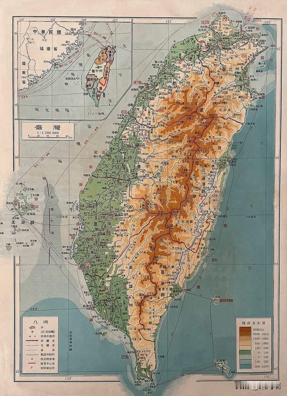 这张图片是一张1926年至1945年间(日治时期)的台湾全图。 1. 地图概况与断代 行政区划: 地图上清晰标记了“五州三厅”的行政架构,即台北州、新竹州、台中州、台南州、高雄州,以及花莲港厅、台东厅、澎湖厅。 关键特征: 澎湖在1926年从高雄州独立设为“澎湖厅”,地图中已显示澎湖厅独立,因此该图测绘或发行于1926年以后。 比例尺: 地图标注比例尺为 1:1,200,000。 2. 主要内容分析 地形与水深: 地图右下角设有“陆高及水深”色阶表,深褐色代表海拔3000公尺以上的高山(如玉山、雪山等),蓝色深浅表示周围海域的深度。 交通设施: 图中以红线标记了当时的纵贯铁路(基隆至高雄)及分支线路(如屏东线、宜兰线等),以及正在开发的道路网。 凡例(图例): 左下角图例包含州厅界、郡市界、支厅界、特别开港场(如基隆、高雄、淡水等)以及无线电信所等地理资讯。 插图: 左上方有一幅“中华民国”东南沿海与台湾关系的缩图,反映了当时日本治理下对邻近地缘政治的呈现方式。 3. 历史背景 此时期的台湾被日本视为“模范殖民地”,进行了大规模的土地调查、基础建设和资源开发(如制糖、林业和水力发电)。