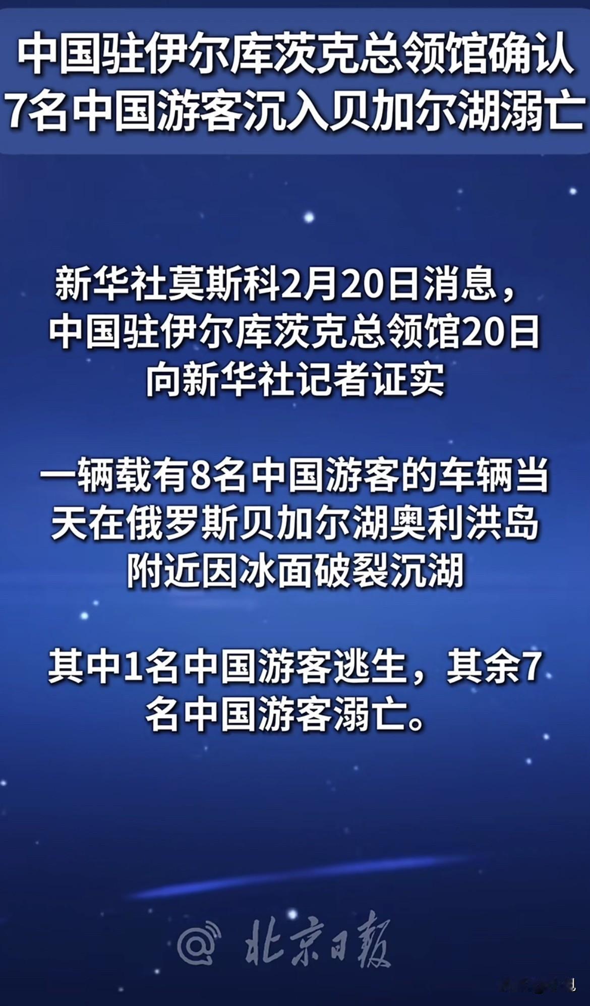 家人们谁懂啊,又是贝加尔湖,又是冰面开裂,又是中国游客。 就昨天,2月20号,一辆车直接沉了,7个人没了。车掉进去那个地方,叫"三兄弟岩",听着名字就让人觉得不吉利 。 有个游客说,出事前一天,她刚好去过那个地方 。 她看到的冰面啥样?到处都是裂开的缝,大的小的,跟蜘蛛网似的。她们那个司机开着车,回来的时候为了躲这些冰裂缝,绕来绕去,找了半天才找到回去的路 。 这姑娘还说,她当时站在一条冰裂缝旁边拍照,快门还没按呢,就听见脚底下"咔"的一声,吓得她撒腿就跑,心怦怦跳 。 谁能想到,她听见冰裂跑开保了命。第二天去的人,就没这么幸运了。 还有人亲眼看见了。当地时间下午2点多,一个人就站在不远处,眼睁睁看着一辆车从一个冰裂口子里栽下去 。 他说,那车沉得特别快,也就一分钟,咕咚咕咚,全进去了,湖面又平得跟镜子似的,啥都看不见了 。 一分钟,60秒。车里8个人加1个司机,就爬出来一个 。 那个爬出来的人,是挤碎了冰拼命钻出来的,还是被水冲出来的?没人知道。只知道他是唯一的活口。 当地人说,最近气温不对劲 。往年这时候零下二十多度,今年旁边的伊尔库茨克都零下3度了 。冰面看着一米多厚,其实里头已经开始化了,冰层跟烂棉絮似的,根本不结实。 关键是什么?20多天前,1月28号,就在这附近,也是载着中国游客的车,在冰上翻了,一个75岁的阿姨当场没了 。总领馆当时就发通知,说贝加尔湖冰面全是看不见的裂缝和鼓包,严禁开车上去,要坐就坐气垫船 。 通知发了还不到一个月,又出事了。 等到这7个人沉下去,当地才急急忙忙发禁令,所有车不许再上冰 。 晚了,真晚了。 你们说,这7个人掉进那个冰窟窿里的时候,最后那一分钟,在想什么? 是后悔上了这辆车,还是想起家里等着吃饭的人? 这车到底是谁非要开的?是那个俄罗斯司机拍胸脯说"没事我熟",还是游客自己觉得"来都来了"? 如果你是那个唯一活下来的人,往后几十年,还敢看见冰吗? 评论区聊聊,这事到底怪谁?