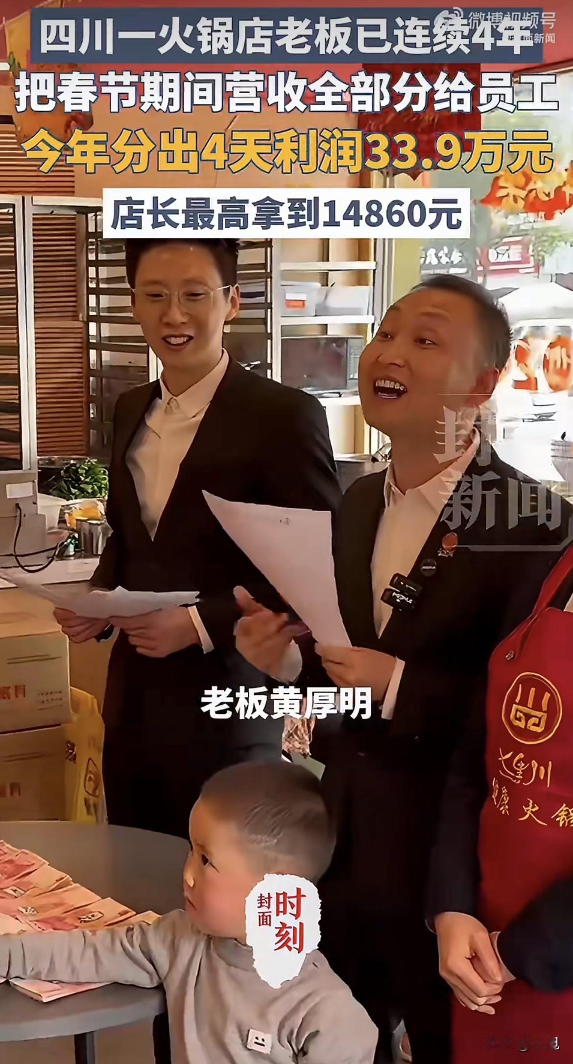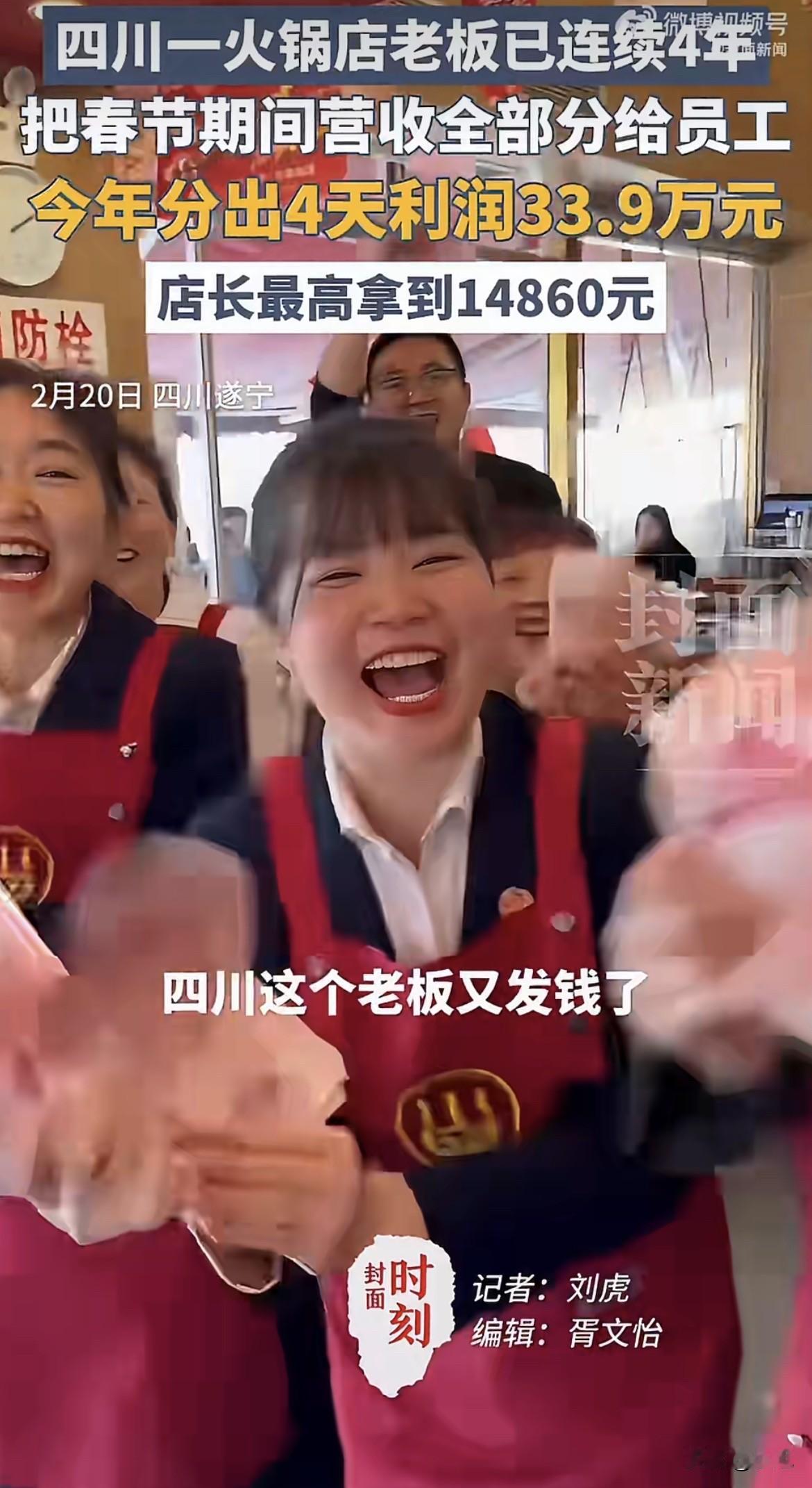 又来了,那个发钱的老板又出现了。 大年初四,四川遂宁,七里川火锅店。一堆现金码在桌子上,服务员、传菜员、后厨、保洁,排着队上去领。三十三万九,春节前四天的利润,老板一分没留,全分了。店长拿了一万四千多,服务员高的拿到四千八,就连打扫卫生的阿姨,也分到手一千四百四十七块。 这已经是第四年了。 但今年有点不一样。老板黄厚明一开始根本不想说话,憋了半天,冒出来一句:说实话,今年确实很难。 难在哪?他没细说,但话里话外听得出来,翻台率下来了,客单价也不如前两年。那阵疫情后报复性消费的热乎劲,已经过了。现在才是真正过日子的时候。 可就在这种情况下,他反而多分了一天。以前是除夕到初二,今年把初三也加进去了。 合伙人当初是反对的。第一年发钱,就有人说你这不是犯傻吗,人家拿了钱,过完年不来上班怎么办?黄厚明不是没担心过。 结果呢。第二年春节后,全员准时回来了,还有人把自家亲戚带来店里帮忙。 其实去年开始,七里川就不止一家店了。八家店,近两百号人。今年春节三天,八家店总收入一百零五万,刨掉食材成本,剩下五十三万二,全分给员工。最高的那个员工叫曾美连,拿到手一万七千九。 曾美连说,她来七里川五年了,每年春节都能分到钱,每年都是一万起步。从来没想过离开,在这儿干活,心里暖和。 但这事吧,没那么简单。 黄厚明年轻时干过服务员,知道过年时候端盘子是啥滋味。人家在桌上团圆,你站旁边倒水,心里能好受?他说发钱不是什么大道理,就是当年自己当服务员时候想过的事,现在能做了,就做。 去年生意也没多好,他没急着开新店,反倒砸钱建了个一万七千平的火锅工厂。员工全员五险一金交上,每个月还给父母发孝顺金,管理层五百,员工三百,直接打给老家老人。工厂那边,双休、法定假,一样不少。 那个工厂,叫川味里。去年十月就已经提前完成全年目标,产值六千万,线上直播一天播六个小时,火锅底料日产能十吨。 有人问他,你这不是给自己找罪受? 他没吭声。 这事传开以后,有人跑来取经,听完回去就没下文了。黄厚明知道人家怎么想的,不是学不会,是学不了。他撂下一句话:真到掏钱的时候,卡住的不是钱,是那个念头。 第一年发钱的时候,一个服务员拿到手跟他说,孩子下学期的学费够了。去年,有人买了车,有人凑齐了首付。 严熙承是七里川的总经理,他说公司目标不止于此。明年准备分四天,将来想分春节七天。房租、水电、气费,公司自己扛,营收刨掉食材,剩下的全给员工。 有人问过黄厚明,万一哪天发不出来怎么办? 他没绕弯子:那就跟他们说实话,大家一起想办法。但只要能发,我就发。 今年钱发完了,明天还得开门做生意。后厨该切菜切菜,前厅该端盘子端盘子。火锅还是那个味,日子还是那个日子。 唯一不一样的是,这三十三万九,留在了三十三户人家的锅里。 这种事,你怎么看?