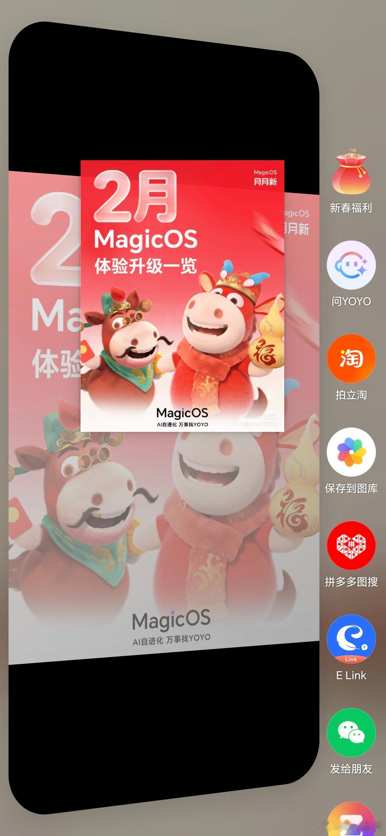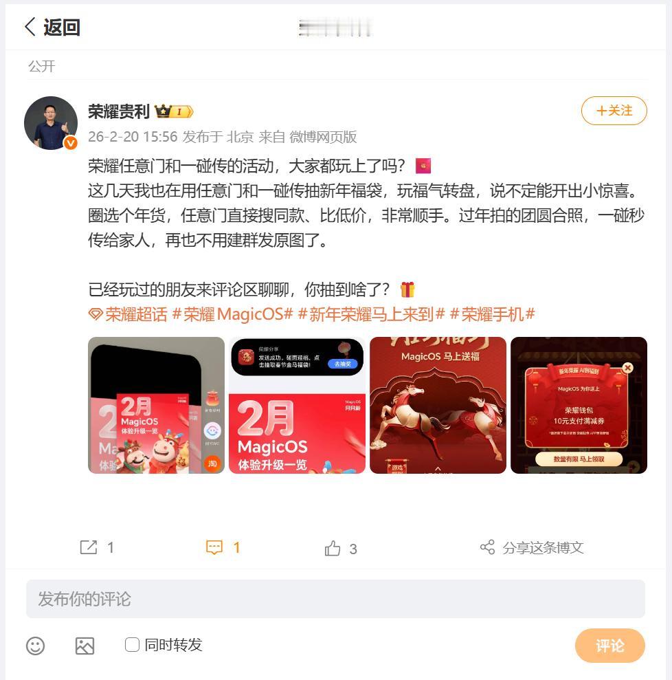 荣耀MagicOS带来的荣耀任意门、荣耀一碰传的功能,小伙伴们有没有使用上呢?刚刚看到荣耀MagicOS产品总监贵利表示,在这个新年假期,还能够参加新年福袋的活动,圈选年货之后,还是可以搜同款、比谁的价格低,一碰秒传照片分享起来也更方便啦,大家有没有使用过呢?畅聊数码新品 数码资讯