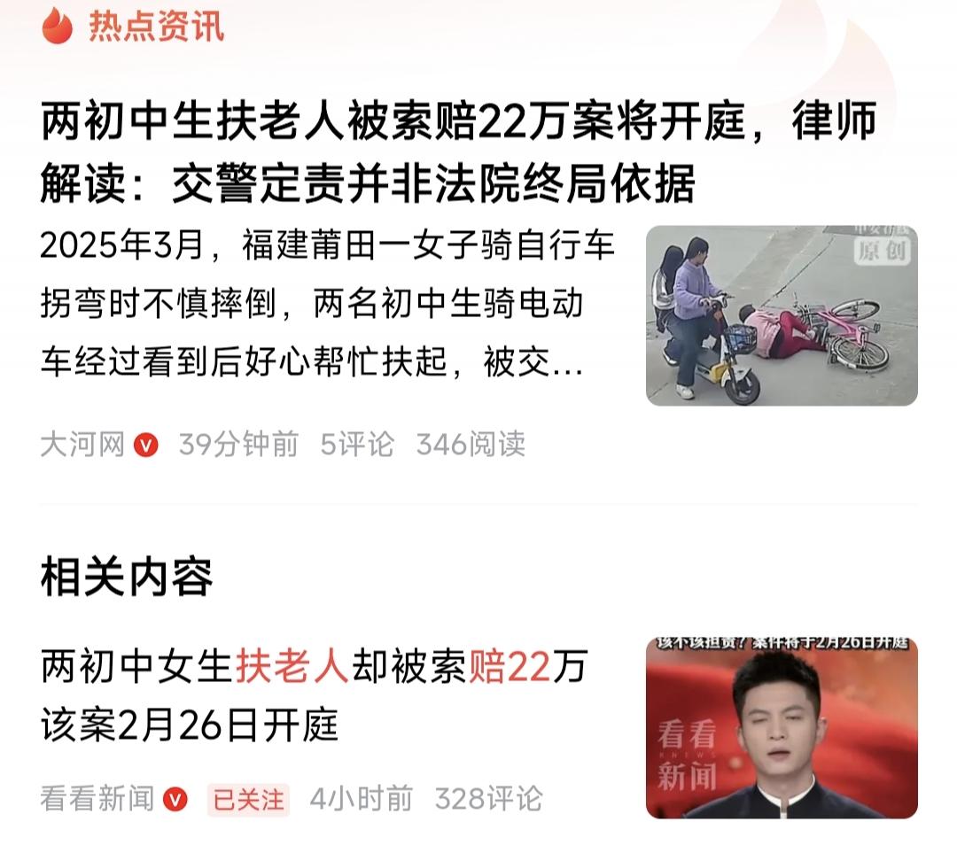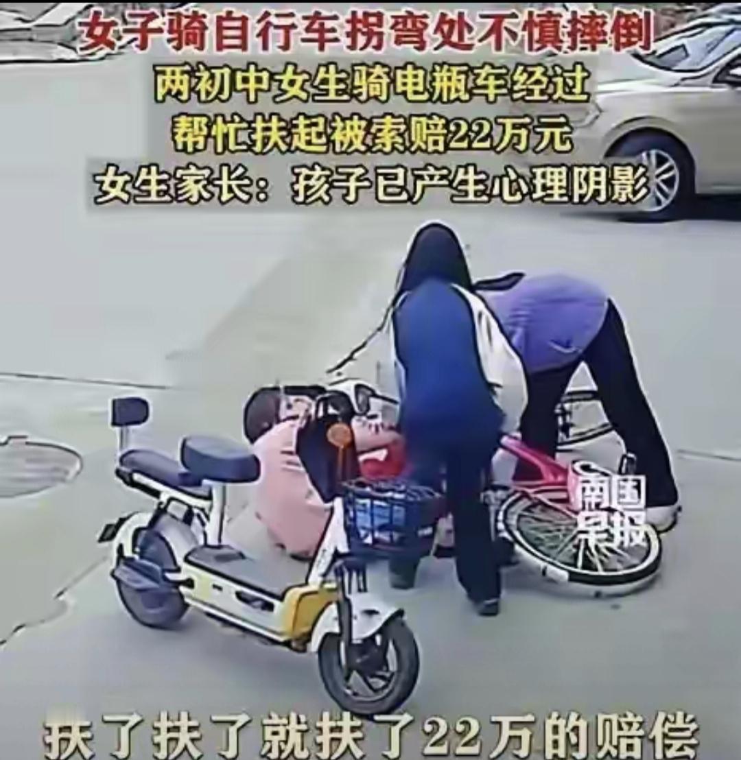 两位中学生扶起摔倒的老人,被索赔22万元。事情的经过是一位老人骑自行车,看到前面骑摩托车的两个中学生,说被吓住了摔倒了,索赔22万元。 看到这个画面,我不知道该说什么。如果这样的索赔也能被判成立的话,这样无接触式摔倒事件我相信以后会越来越多,我都可以说被你吓住了,我摔倒了。 其实我们都不希望老人被摔倒,希望老人平平安安。但有一码说一码,我反反复复看了很多次这个视频,这个事情就是因为老人骑自行车操作不当,导致自行车失去平衡摔倒。毕竟它和摩托车之间还有这么大一段距离,正常人骑摩托车的话是不会摔倒的,那对老人是不是要特别处理呢,这件事情一定要处理好。两个中学生骑摩托车有违规的地方,但我认为和老人摔倒并没有直接的关联,如果这真的能关联上的话,那么以后类似的事件会越来越多。比如在商业街十字路口,行人来来往往,如果自己摔倒了,是不是也可以向前面紧挨着你行走的人索赔? 这个案件的判别又具有极大的示范效应,尤其对全国广大的中小学生而言,判别结果一定会被各个学校,千万父母作为孩子教育的样本,希望不要成为又一个彭宇案。 两个中学生应该负多大的责任,这也是全网关注的焦点,我们相信法院一定非常公正的判决。但如果说是因为被骑摩托车的孩子吓住了,从而摔倒了就索赔22万元。那也可以认为老人骑自行车的技术没过关,就不应该上路。这样说,是不是有点蛮不讲理,但换个角度来看,不是没有道理。 希望这个判决有个好的结果,符合事实的真实情况,希望判决结果不要让社会风气再次倒退,彭宇案就是一个典型的例子。