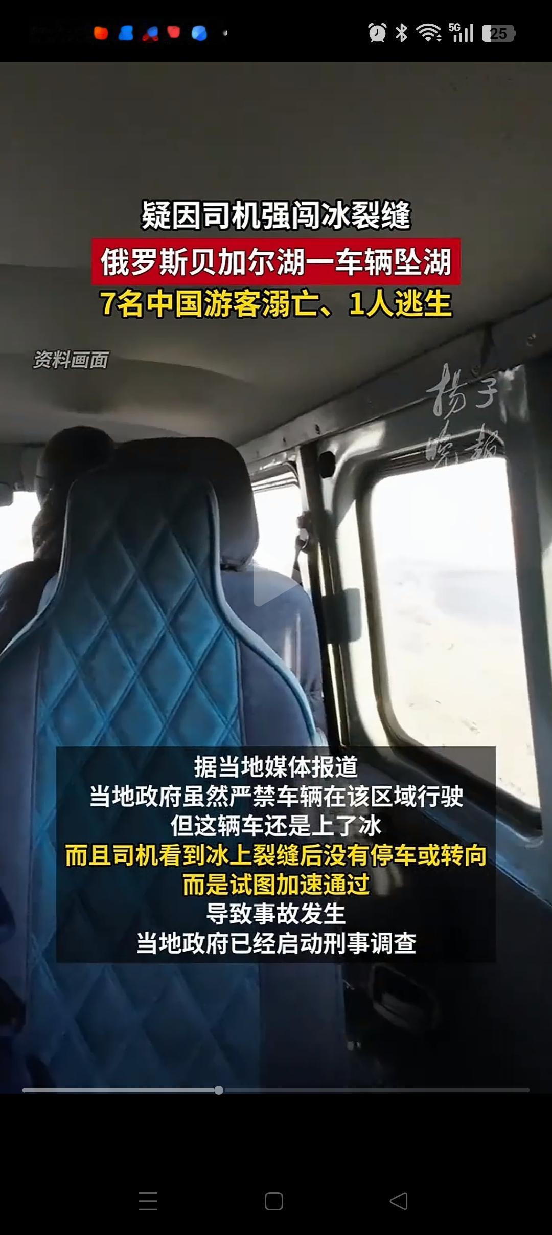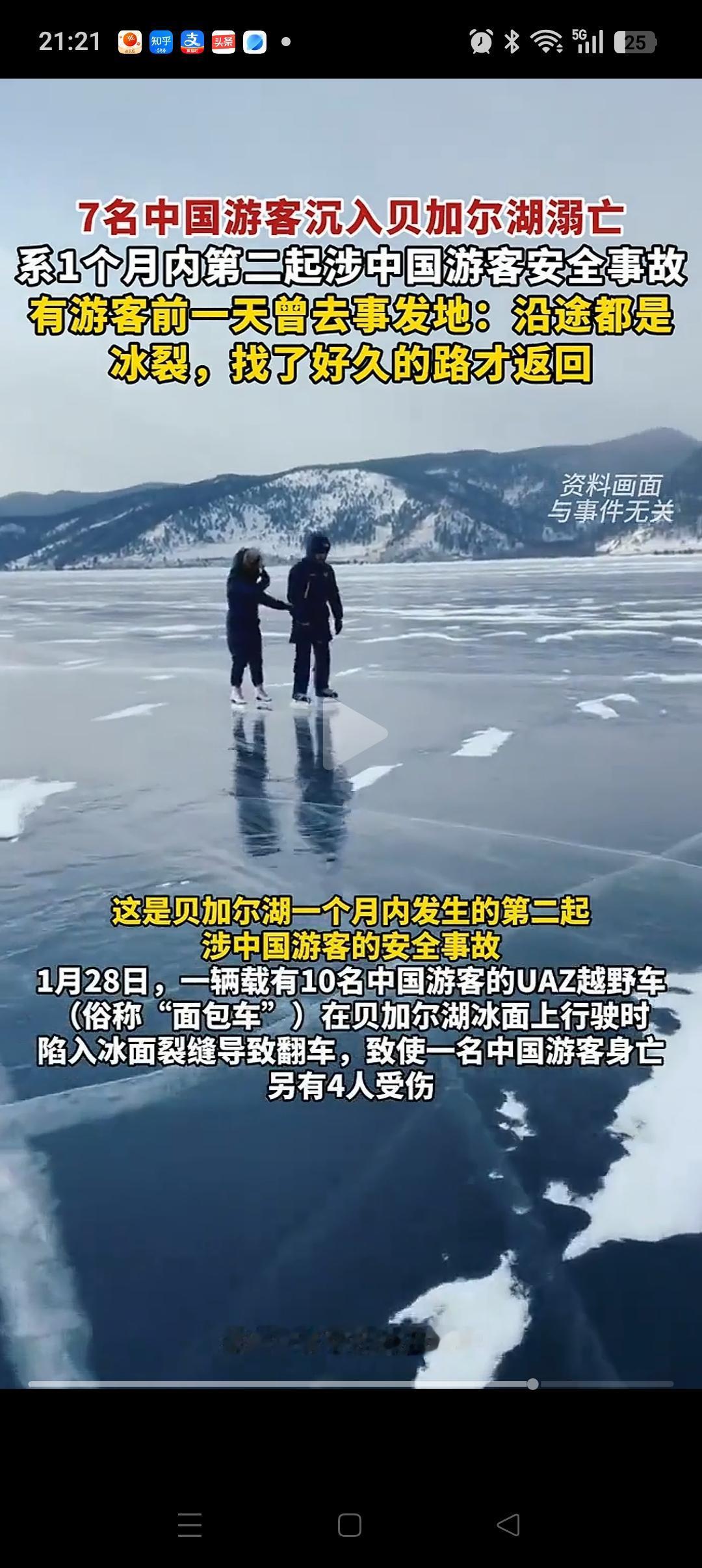 7名中国游客本来是去旅游的,没想到却永远的留在了俄贝加尔湖冰冷的湖底。[流泪]一位曾经去过现场的目击者透漏:沿途都是冰裂,幸运的是她们当初选择了返回。 现在就算漠河,基本也没人敢这么上冰面。因为水下的情况,你基本观察不到。 记得前两天,哈尔滨就已经在拆除雪人了。说明今年的天气比往年热,不能按照以往的常理去推算。 当地的这位向导司机还是胆子太大了,明明知道之前就有类似的情况,还是执意前往。 苦了这7名游客,本来是去旅游的,就这么沉入了冰冷的湖底,可惜[祈祷][祈祷]