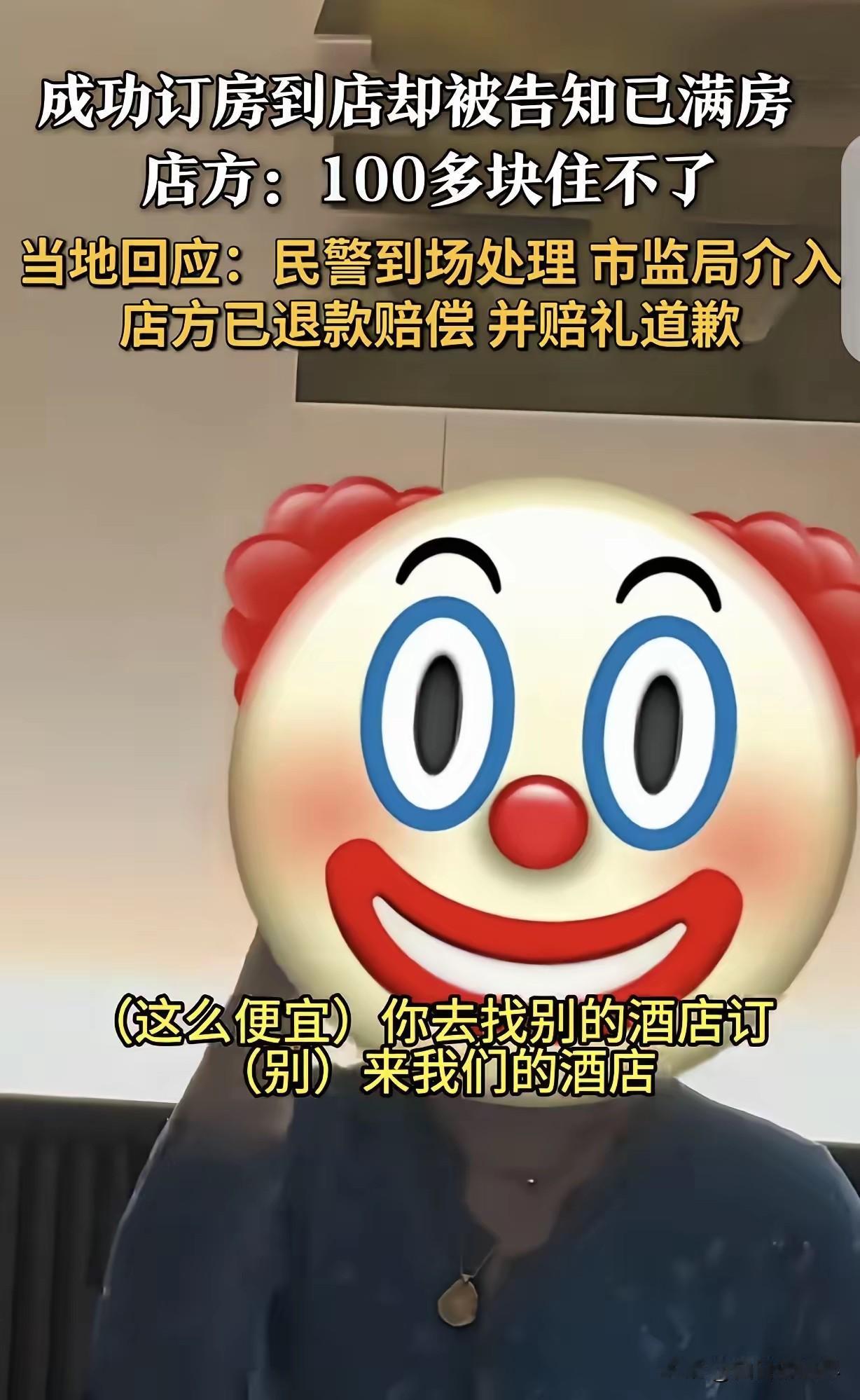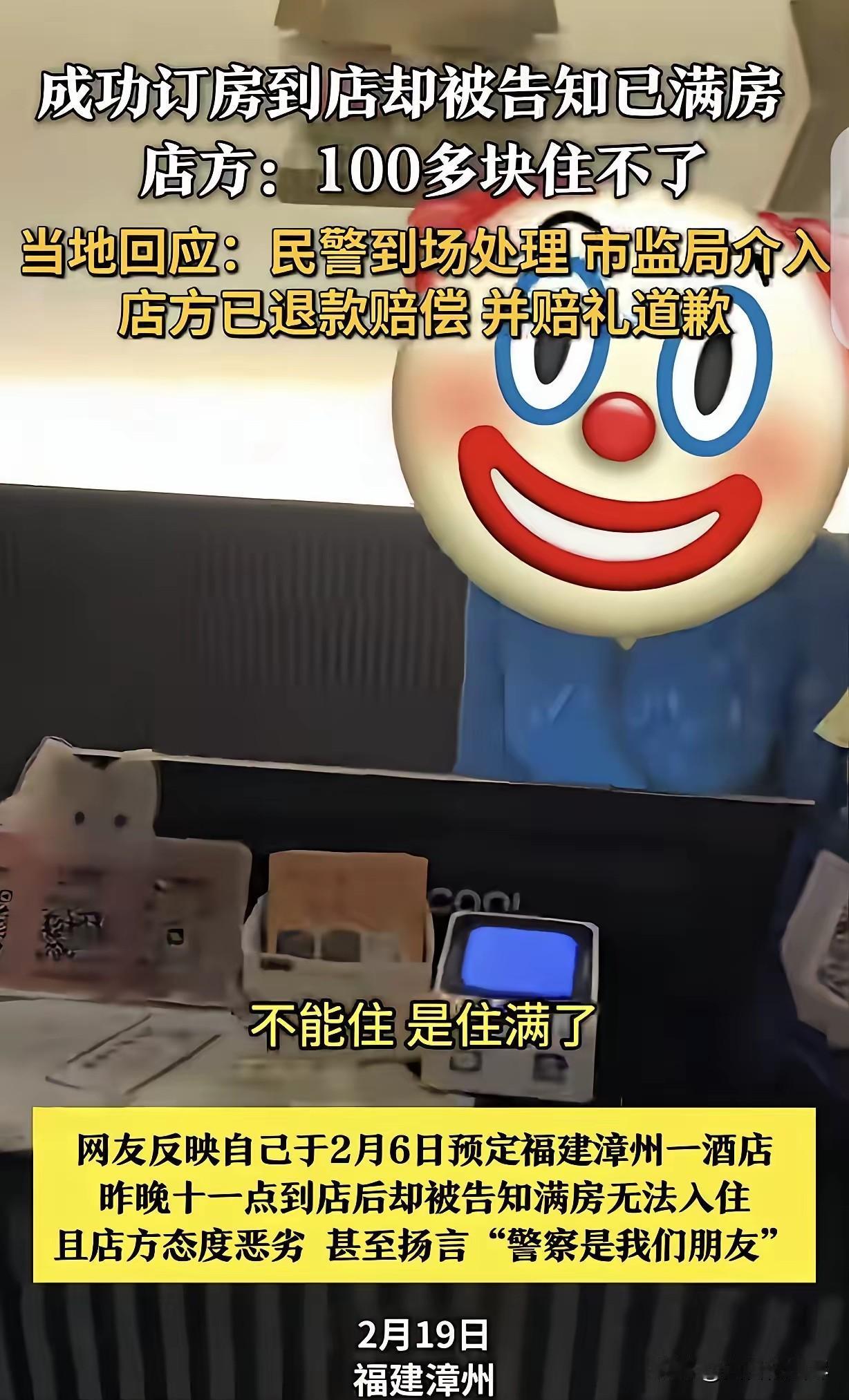 “玩不起!”福建漳州,一女子花106元订了某酒店,12天后,当她晚上11点多入住时,却被告知满房无法入住。女子气坏了,跟酒店理论,酒店却态度嚣张:你们2月6日订酒店才106元,100多块住不了我们酒店,这么便宜,你去找别的酒店订。女子怒了,要求退还106房费,并赔偿500元,老板亲自给自己道歉。 2026年2月18日深夜11点多,福建漳州一家酒店门口,上演了让游客气愤不已的一幕。一名女子提前12天在平台花费106元预订房间,平台已确认订单并锁定房源,当晚她拖着行李赶到酒店准备入住,却被工作人员告知满房无法安排。 女子当场提出质疑,酒店工作人员不仅不解释,反而态度嚣张,直言100多元的价格在春节期间无法入住,催促女子尽快离开,别在现场争执。女子被这番操作激怒,坚决要求退还106元房费、赔偿500元,并要求酒店负责人当面道歉。 2月6日,女子为春节出行提前做准备,在网络平台挑选漳州云霄县的住宿,看到这家酒店价格实惠,便以106元的价格完成预订,支付成功后收到平台确认信息,订单状态显示为有效可入住。 女子担心春节期间房源紧张,特意提前半个月锁定房间,避免临时无房可住,出发前还再次核对订单,确认一切无误,才安心踏上行程。 大年初二当晚,女子赶路至深夜,抵达酒店时已经疲惫不堪,只想尽快办理入住休息。她来到前台出示订单信息,工作人员简单查询后,直接告知酒店已满房,无法为她办理入住。 女子十分不解,自己提前多日预订且订单有效,平台也未通知异常,怎么会突然无房,她当即与工作人员沟通,希望酒店履行入住承诺。 工作人员见女子坚持理论,不再掩饰真实想法,直言女子2月6日预订的价格过低,106元在春节期间根本无法入住该酒店,言语间充满不屑与不耐烦。 工作人员不断驱赶女子,让她自行寻找其他酒店,不要在前台纠缠,态度恶劣且毫无歉意,完全无视已经生效的预订订单与消费者的合法权益。 深夜的街头,女子孤身一人拖着行李,既委屈又愤怒,奔波一天的疲惫被瞬间激起的火气取代。 她明确拒绝酒店随意退单的处理方式,提出三项诉求,全额退还106元预订房款、赔偿500元损失、酒店老板亲自出面道歉。酒店方起初依旧强硬,不愿满足女子的合理要求,双方僵持不下。 女子没有选择妥协忍让,当场保留好订单截图、支付凭证与现场沟通记录,随后拨打报警电话与市场监管部门投诉热线,寻求官方介入处理。 民警与市场监管工作人员迅速抵达现场,逐一核实订单信息、酒店入住台账与房源情况,查明酒店并非真正满房,而是因春节房价上涨,故意拒绝低价订单,想将房间留给出价更高的客人。 在确凿的证据与执法部门的调解下,酒店方瞬间收起嚣张态度,负责人主动出面与女子沟通,承认工作失误与违约行为, 当场全额退还106元房费,并按要求支付500元赔偿金,郑重向女子鞠躬道歉。女子接受道歉与赔偿,这场因酒店毁约引发的纠纷,最终以消费者维权成功落下帷幕。 这段经历被女子分享后,迅速引发网友热议,大家纷纷斥责酒店见利忘义、缺乏契约精神,同时为女子果断维权的行为点赞。 春节出行旺季,提前预订的订单本就具备法律效力,商家为追求更高利润恶意拒单,不仅伤害消费者信任,也违反相关法律法规,最终只会自食恶果。 诚信经营是服务业的立身之本,无论淡旺季,商家都应信守承诺,履行生效订单约定,尊重每一位消费者。 这起事件也为外出游客提供了维权参考,遇到恶意拒单、加价刁难等情况,保留证据、及时投诉,就能合法维护自身权益。 对此,你们有什么看法,欢迎评论留言~