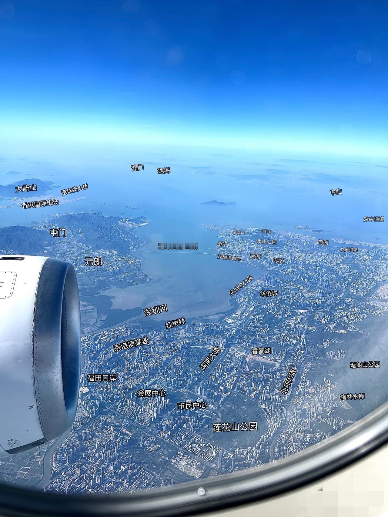 飞往海南的航线 途径大湾区上空 几分钟之内游览了 广州、深圳、香港、澳门、珠海 太刺激辣 所有的地标都看的清清楚楚