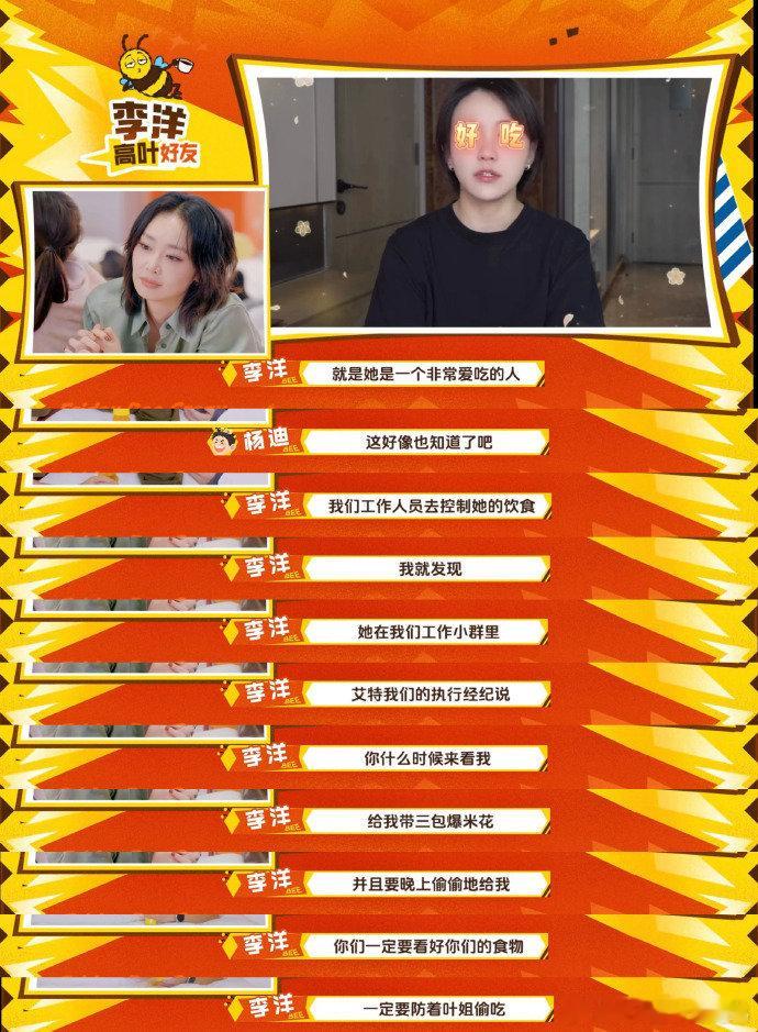 高叶只是犯了吃货该犯的错被高叶和好友李洋的互动笑到,李洋直接在节目里把高叶爱吃的样子全说出来,完全是实名出卖,身边一群人还都当监督员盯着她的嘴