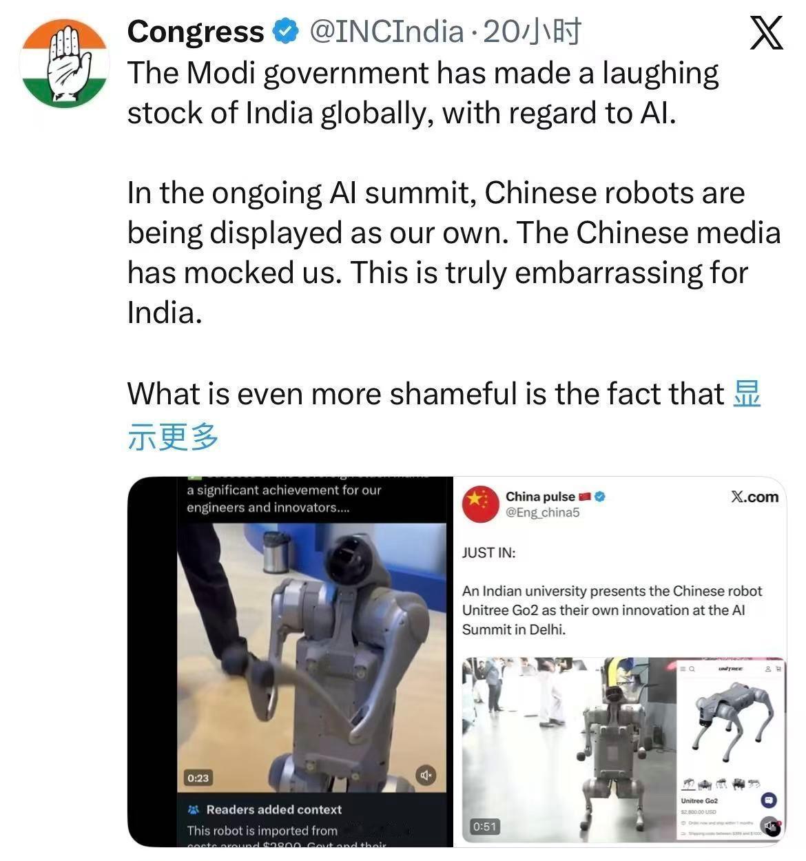 不知道大家有没有同感?我反正是看一次笑一次,印度这场AI峰会,直接变成了国际大型尴尬现场! 最近在新德里举办的印度人工智能影响力峰会上,加尔戈蒂亚斯大学的女教授妮哈·辛格,对着镜头大肆宣传一款叫“猎户座”的四足机器狗,声称是该校自主研发的硬核成果,连印度电子信息部长都兴冲冲转发宣传。 结果脸打得光速来袭——眼尖的网友一眼戳穿:这根本就是中国企业生产的市售通用款,全球科研圈都在用,压根不是什么印度自研! 事情爆了之后,部长默默删帖,校方赶紧甩锅“沟通不畅”,嘴硬说只是买来当教学工具,绝口不提冒充自研的事。 但海外网友根本不买账,嘲讽刷屏一片;印度反对党更是直接开炮,痛批这是国家级公关闹剧,让印度沦为全世界的笑柄,国家形象严重受损。 主办方更是当场翻脸,直接给这所大学断电、撤展、逐客令,狼狈离场。 更讽刺的是,这场峰会还被曝出组织混乱、展品失窃等一堆问题,所谓的“印度AI高光时刻”,彻底变成了笑话。 踏踏实实搞研发才是硬道理,靠偷换概念、剽窃造假撑门面,最后只会自己打自己的脸。