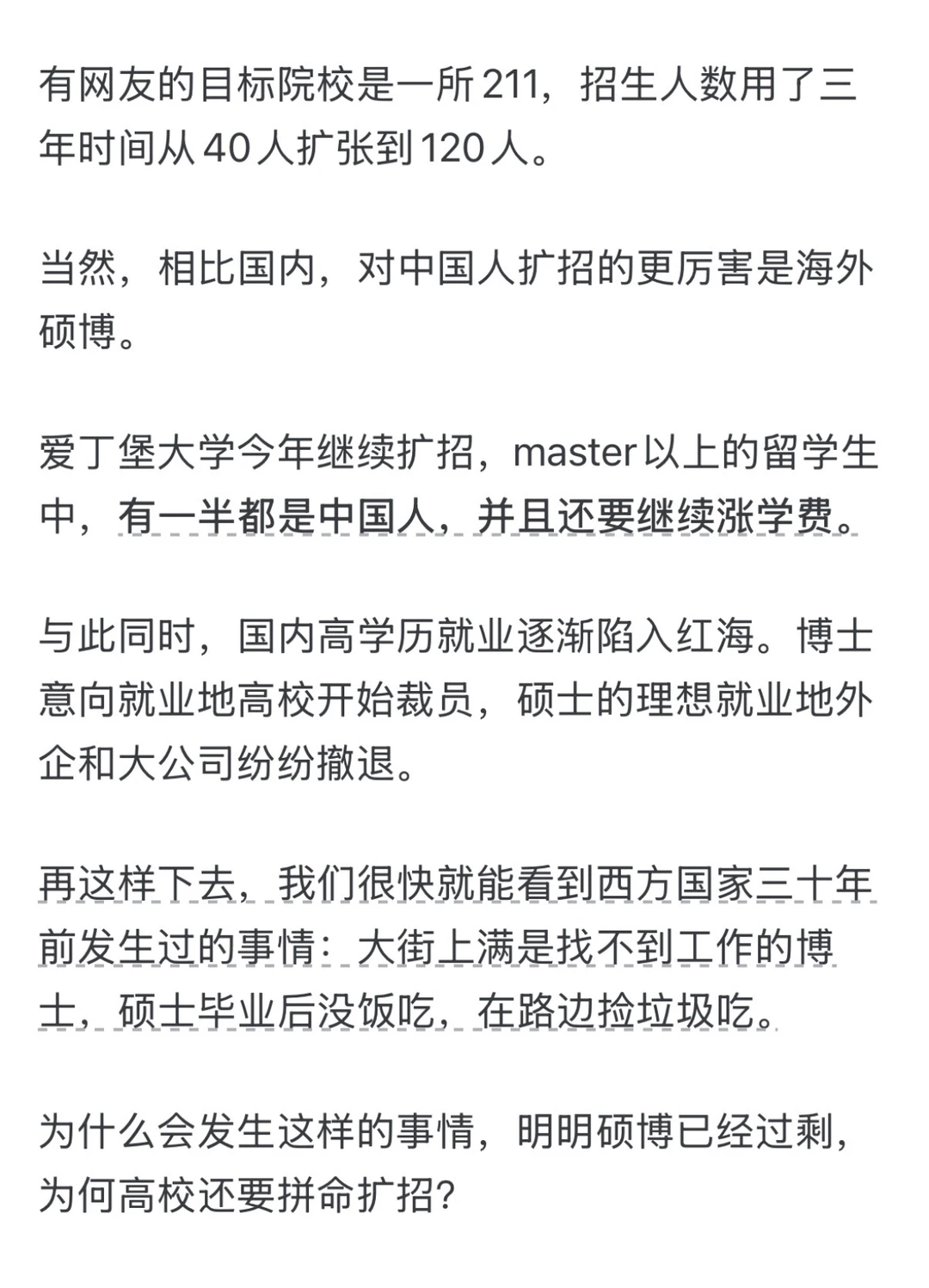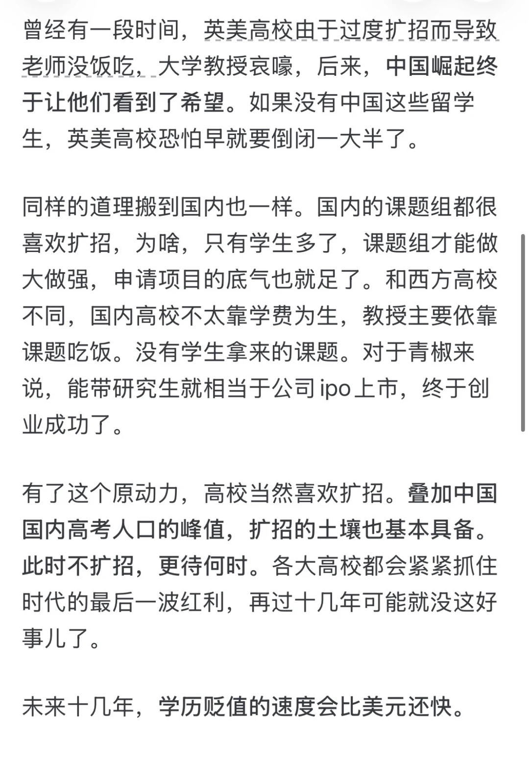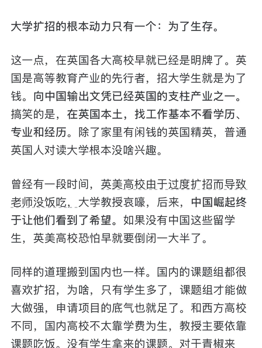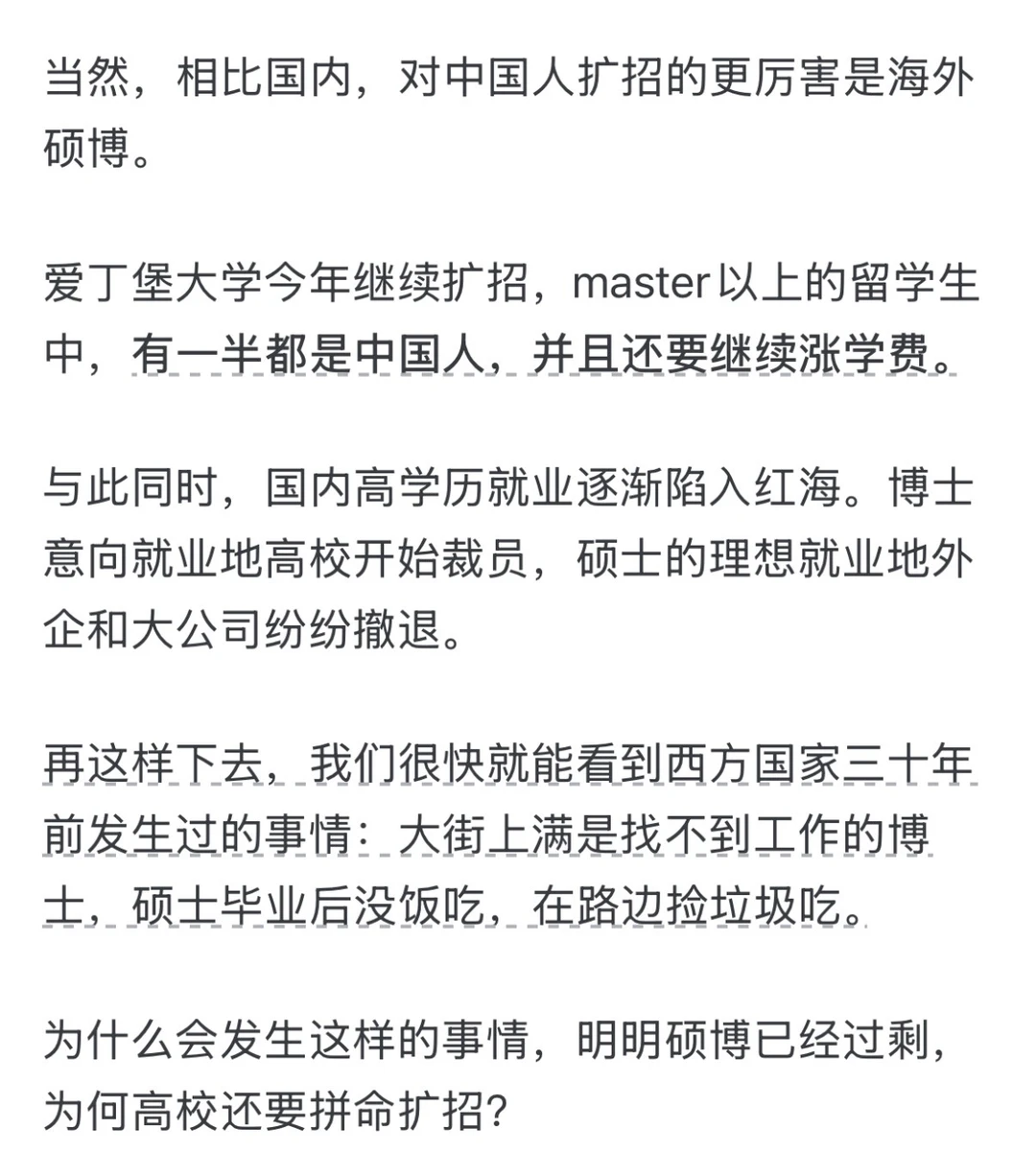 曾经有一段时间,英美高校由于过度扩招而导致老师没饭吃,大学教授哀嚎,后来,中国崛起终于让他们看到了希望。如果没有中国这些留学生,英美高校恐怕早就要倒闭一大半了。