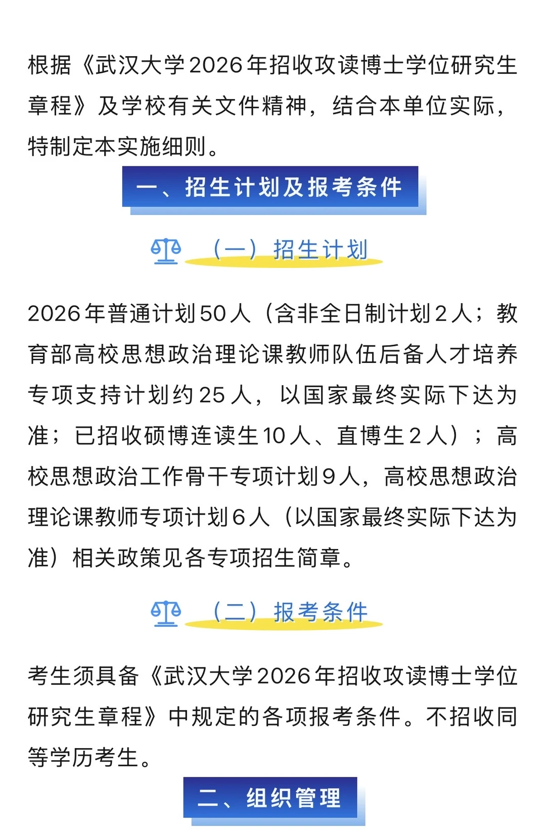 根据《武汉大学2026年招收攻读博士学位研究生 章程》及学校有关文件精神,结合本单位实际,特制定本实施细则。 一、招生计划及报考条件 (一)招生计划 2026年普通计划50人(含非全日制计划2人;教育部高校思想政治理论课教师队伍后备人才培养专项支持计划约25人,以国家最终实际下达为准;已招收硕博连读生10人、直博生2人);高校思想政治工作骨干专项计划9人,高校思想政治理论课教师专项计划6人(以国家最终实际下达为准)相关政策见各专项招生简章。 1(二)报考条件 考生须具备《武汉大学2026年招收攻读博士学位研究生章程》中规定的各项报考条件。不招收同等学历考生。 二、组织管理