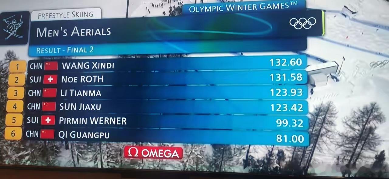 男子空中技巧最后一跳前——两位瑞士选手暂时排名前两名齐广璞第3王心迪第4李天马第5孙佳旭第6。