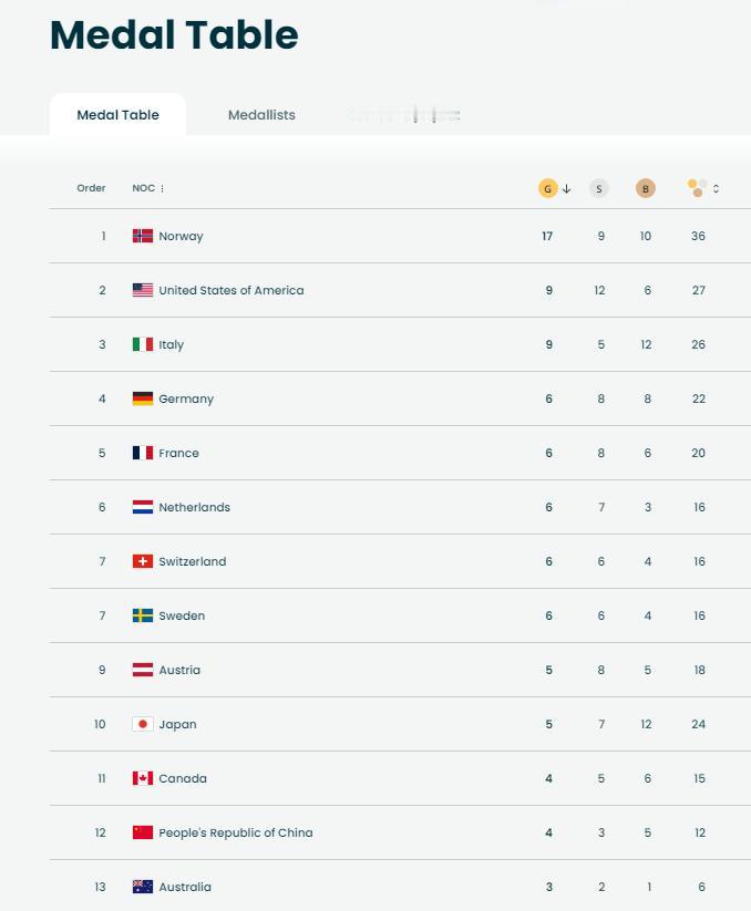 中国拿到4金,但在奖牌榜上位置不动,前进一步都难。 刚刚,王心迪帮助中国队拿到第4枚金牌,中国队在奖牌榜上的位置又要前移了吧? 打开一看,根本没动,还是第12名。 而且,令人十分意外的是,中国队即使再拿1枚金牌,总数来到5金,追平除北京冬奥会之外的最好成绩,也只能排在奖牌榜的第11名。即使拿到6金,也最多只能排在第9名。 进一步居然这么难。