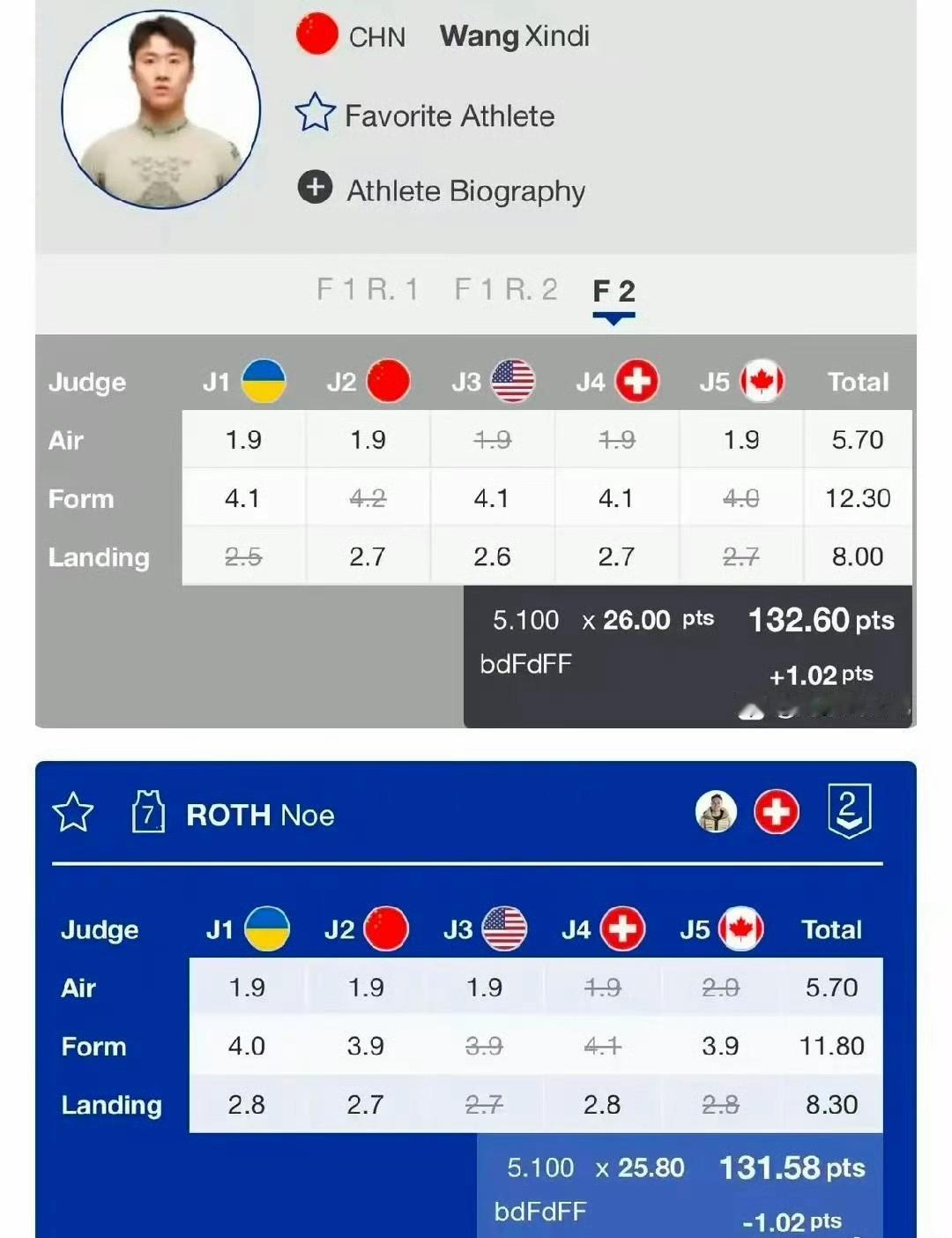 感谢瑞士裁判没有刻意去压王心迪的分数,打出的两项都不是最低,王心迪这才得以顺利夺冠。 王心迪空中赢了0.5,落地输了0.3,难度相同,所以最后5.1乘以0.2等于1.02分,因此以1.02分优势拿下。