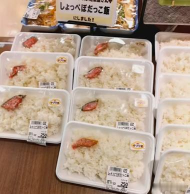 这么说,或许很多人没有概念,看看日本超市货架上米饭的价格吧。一小盒米饭加一小块“鱼肉”就要250日元,250日元还只是“裸价”,加上20日元的税,买到手要270日元(约13.5人民币),而在中国两个素菜一个荤菜的盒饭也就这个价吧,还量大管饱,想吃多少吃多少。