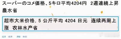 美国人挨饿,我们说得够多了,日本人为啥要吃草呢?这倒不是日本人觉得草比米饭好吃,而是大米实在太贵了。中国5公斤大米的价格大概在50元左右,如果买散装米的话,则是30元钱左右,作为对比,日本5公斤大米的均价是4204日元(约200人民币),这么涨下去,50万日元一袋大米绝不是玩笑。