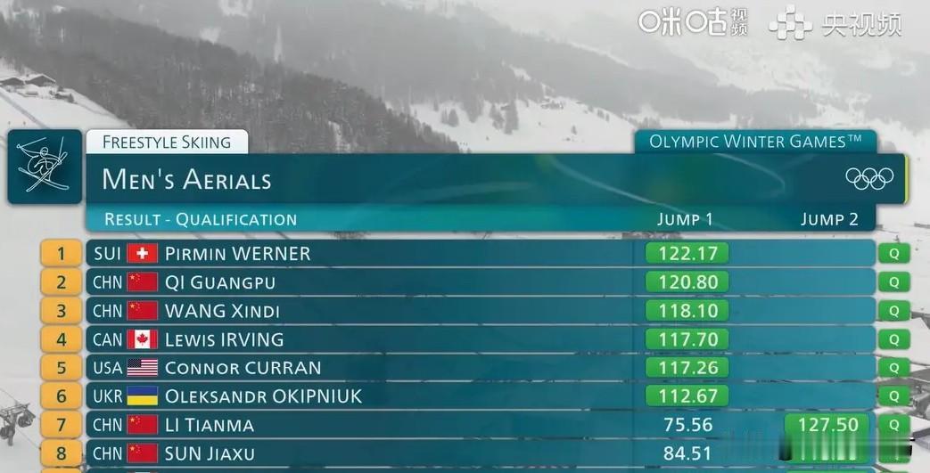 刚刚结束的米兰冬奥会自由式滑雪男子空中技巧预赛,和之前的女子比赛一样,四位参赛的中国选手全部晋级最终的决胜轮,直指冠军。其中,在第一跳第7位出场的卫冕冠军齐广璞和第21位出场的王心迪、也是卫冕了女子冠军的徐梦桃的老公分别拿到120.80分和118.10分,排名前两位直接晋级,无需进行第二跳,而李天马和孙佳旭第一跳没能进入前六直接晋级,在第二跳中,李天马跳出127.50的超高分数,孙佳旭也跳出118.55分,两人分别排名第7和8晋级决赛。