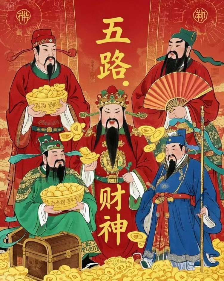 “正月初五·接财神…”财神降临,五路进宝,八方来财,喜乐安