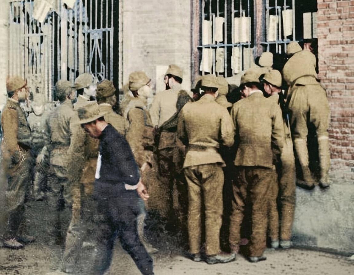 这张照片中,一群日本兵聚集在慰安所外,有的排队等候,有的甚至攀爬在窗户上向内张望,急切地等待进入“慰安妇”的房间。 这些鬼子在慰安所外的排队等待,将被囚禁的女性彻底物化为满足其兽欲的工具,无数中国、朝鲜及东南亚妇女在慰安所内遭受了难以想象的摧残,这段历史是日本侵略暴行的铁证,不容任何美化与歪曲。