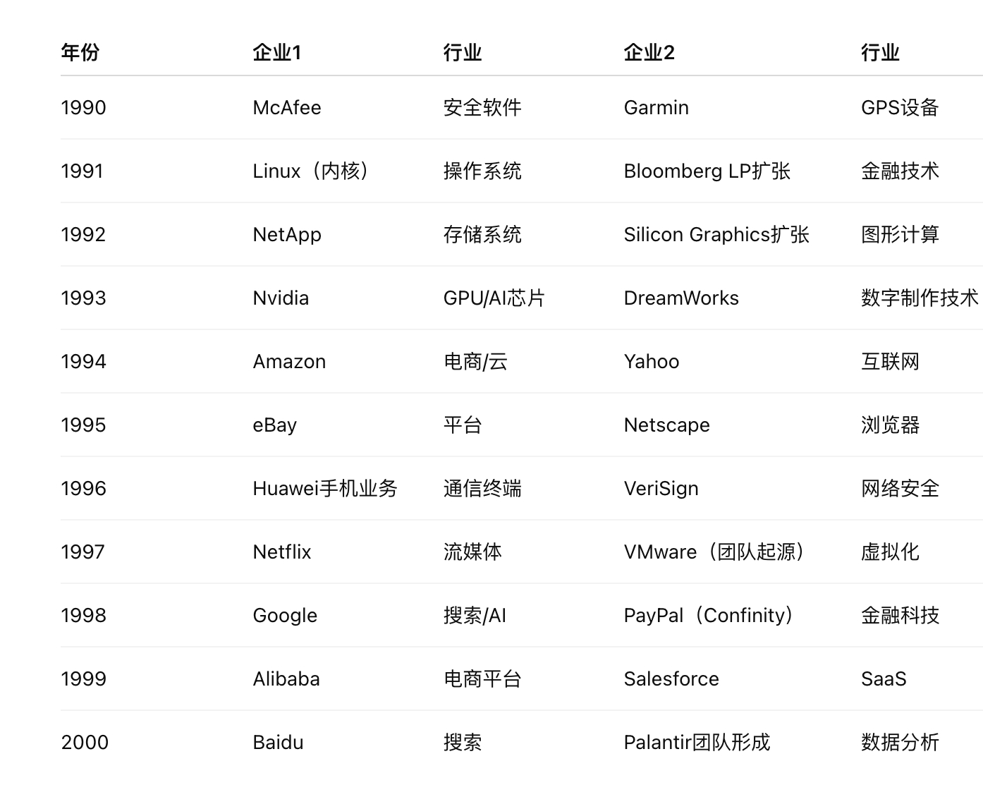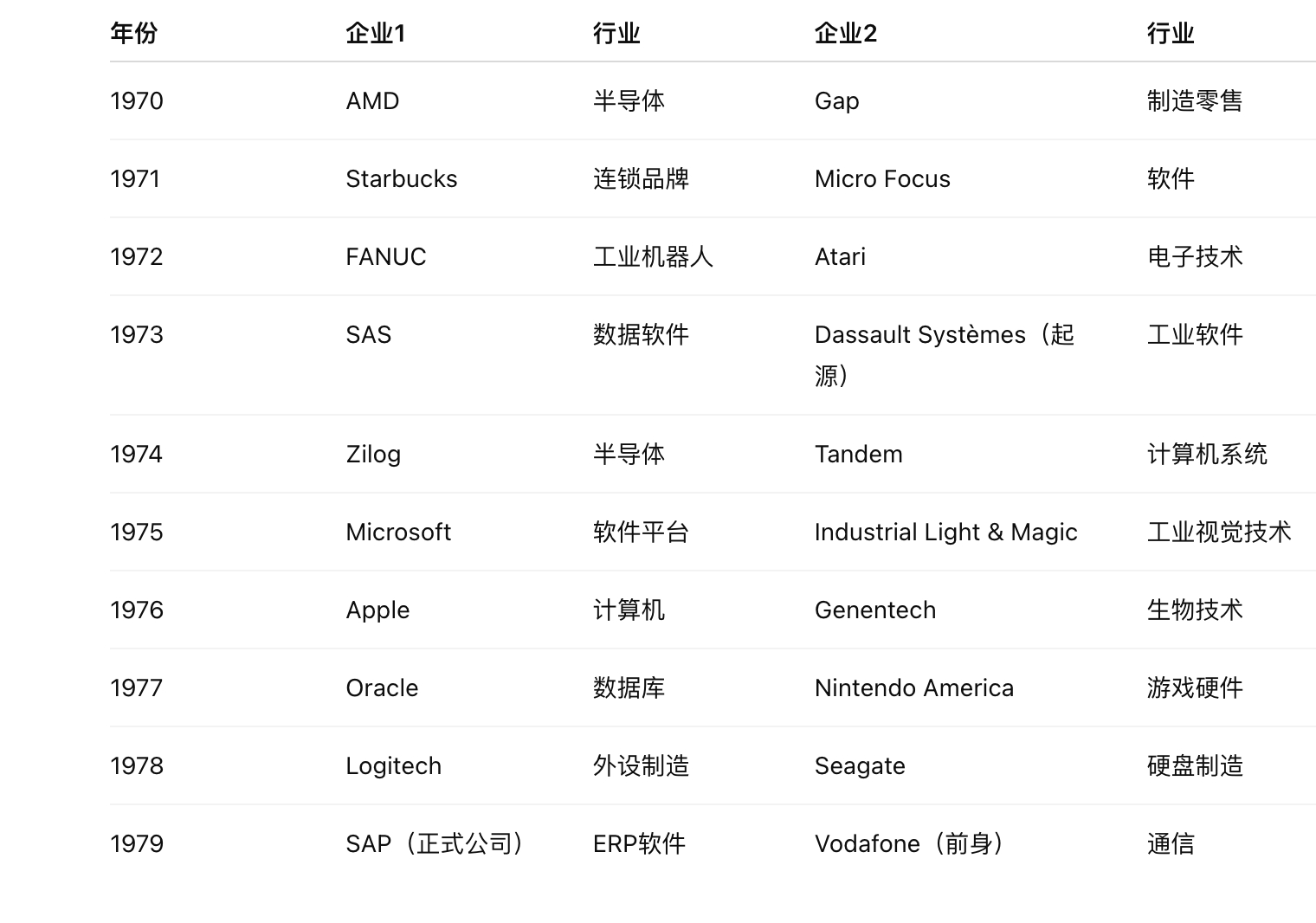 今天有一个发那科的朋友,说他和发那科同岁,都是 1972 年的,另外一个 84 年的说,他和戴尔同岁。我看了下,如果你是 1986 年,那一年联想成立,1987 年是华为成立。93 年有英伟达。98 年有谷歌,2000 年则是有百度。大家可以查查,自己和什么知名企业同岁。