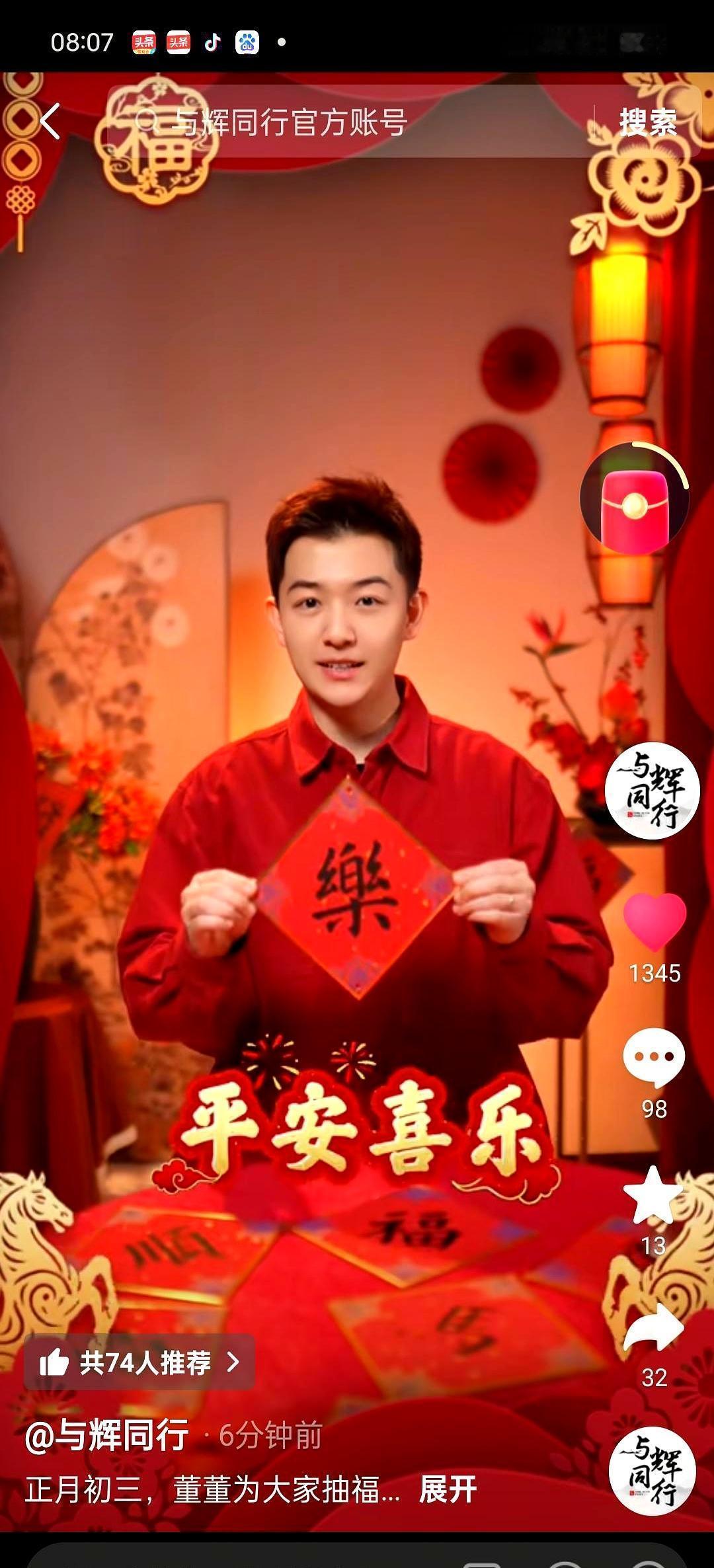 董宇辉团队拜年视频,他排第三才出场,这事真不是小事。 很多人以为是巧合,但细看团队操作,这背后藏着一个关键信号。 自从小作文事件后,董宇辉成立“与辉同行”,人气一直高涨。 春节期间,他直播间带货销售额更是屡创新高。 这次拜年视频,成员出场顺序成了新焦点。 这不是娱乐八卦,而是在明确告诉市场:与辉同行,不是董宇辉一个人的舞台。 它传递的是团队凝聚力,也是在培养新的商业IP。 别光盯着董宇辉,他身后那批人,才是下一个流量宝藏。 看懂这个,你才能跟上新趋势。
