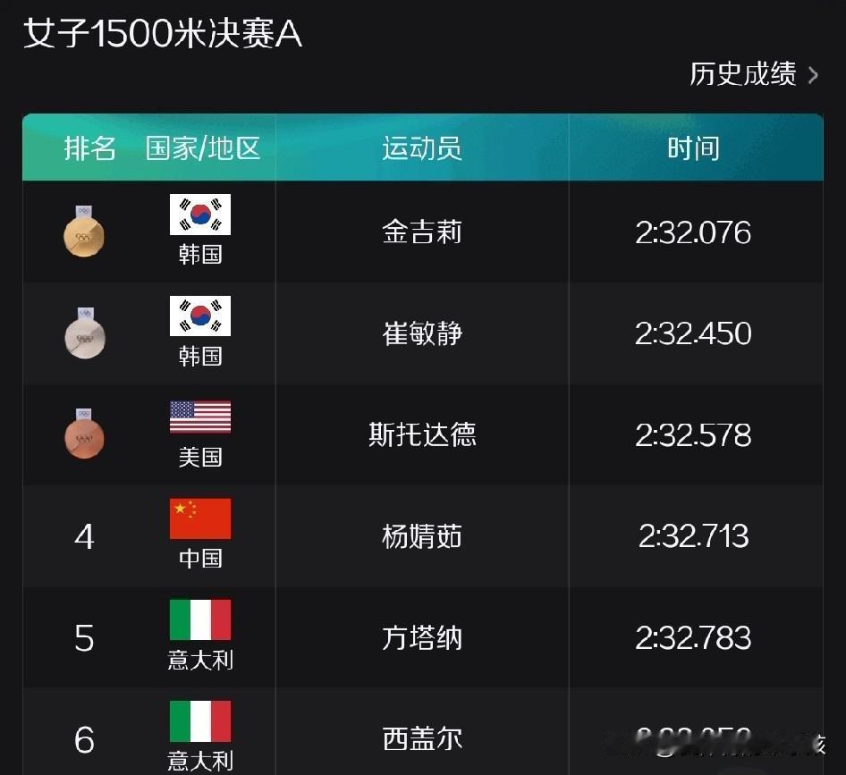 米兰冬奥会短道速滑的赛场上,转眼迎来最后一个单项,也就是女子1500米的比拼。 决赛场上两位韩国运动员可以说用自己的实力证明了他们依然在女子长距离的竞争当中占据优势地位,即使前面美国选手和意大利选手一开始都滑的比较主动,但是随着赛程的深入,金吉莉和崔敏静两位韩国名将还是实现了对美国运动员的超越,各自拼下冠军和亚军位置,美国选手斯托达德则收获一枚宝贵的铜牌。金吉莉的最终夺冠成绩是2分32秒076。 唯一一个代表中国短道速滑队晋级最终A组决赛的小将杨静茹,在决赛中一路跟滑,虽然在后面进入倒数第三圈后战术上打得积极主动,也实现了对两位对手的成功超越,来到前四位置,但整体上来说还是功亏一篑,在最后时刻没能赶超美国运动员斯托达德,遗憾拿到第四名的成绩。即使2分32秒713的成绩对于一位第一次参加冬奥会就晋级A组决赛的年轻小将来说,已经算不错了,但毕竟没能登上领奖台,也让中国女子短道速滑队在这次奥运会上未能实现任何一个项目上登上领奖台的目标,遗憾以零金收官。 整个中国短道速滑队,本届冬奥会也只有孙龙在男子1000米项目上收获一枚宝贵的银牌,创下近几届参加冬奥会的最差战绩。中国短道速滑队的另一个争金项目男子5000米接力也以中国队只是拿到B组头名,无缘领奖台而告终。 我们需要恭喜两位韩国对手崔敏静和金吉莉,同时也需要向杨静茹这种中国小将送上掌声。希望这样第四名的遗憾能让她提升大赛经验,在四年之后帮助她有机会登上奥运会短道速滑1500米项目的领奖台!