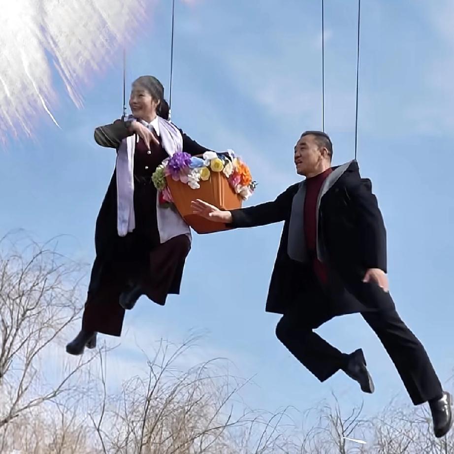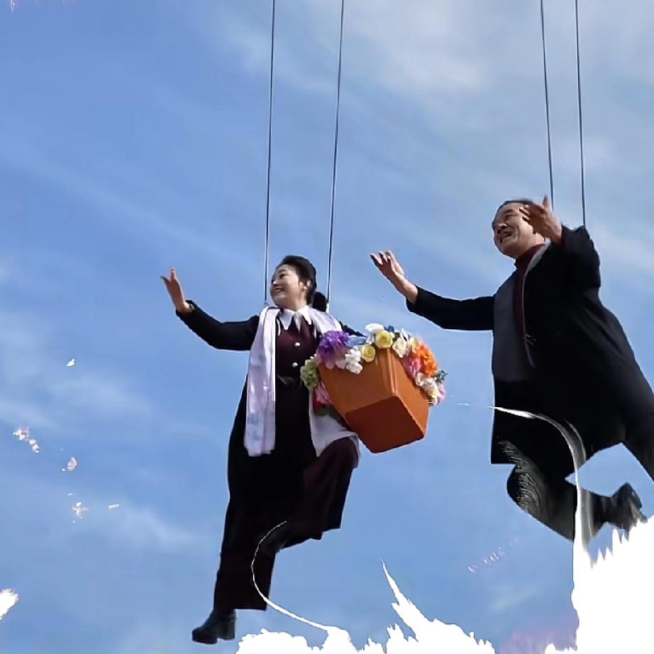 这是蒲剧名家孔向东与其夫人王青丽联袂演绎的黄梅戏《夫妻双双把家还》。对他们而言,以蒲剧高亢嗓音演唱黄梅戏不过是轻而易举之事,不仅动作精准到位,唱腔也是韵味十足。加上吊威亚的动作,更是把《天仙配》的神话传说演到了极致。