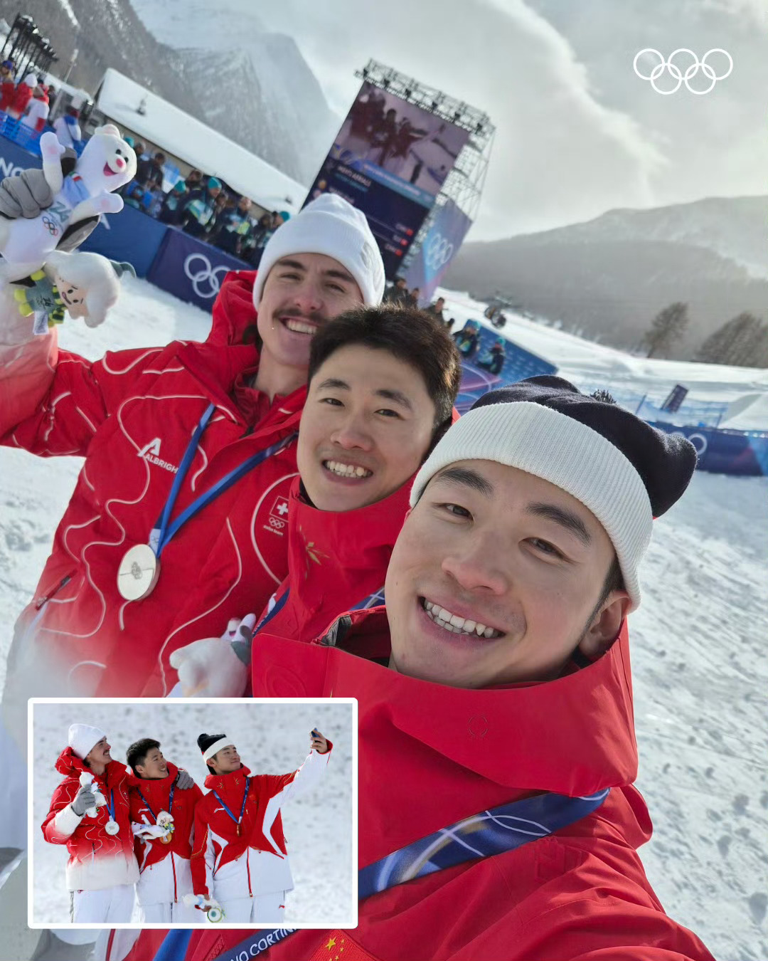 来自自由式滑雪空中技巧赛场的领奖台自拍,为冰雪健儿点赞🏅!(cr:奥林匹克运动会)