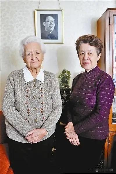 2010年,李立三同志的夫人李沙(左)和女儿李英男在北京家中的合影,背后墙上是李立三同志遗像。李莎原名叶丽萨维塔·帕夫洛芙娜·基什金娜,俄罗斯萨拉托夫人,出身贵族家庭。1936年,她在莫斯科与当时化名“李明”、在共产国际工作的李立三结婚。1946年,她带着3岁的女儿李英男,历尽艰辛从苏联来到中国与丈夫团聚。此后,她将一生奉献给了中国的俄语教育事业,先后在哈尔滨俄语专科学校、北京外国语大学(时称北京俄语学院)任教,为新中国培养了大量急需的俄语人才。