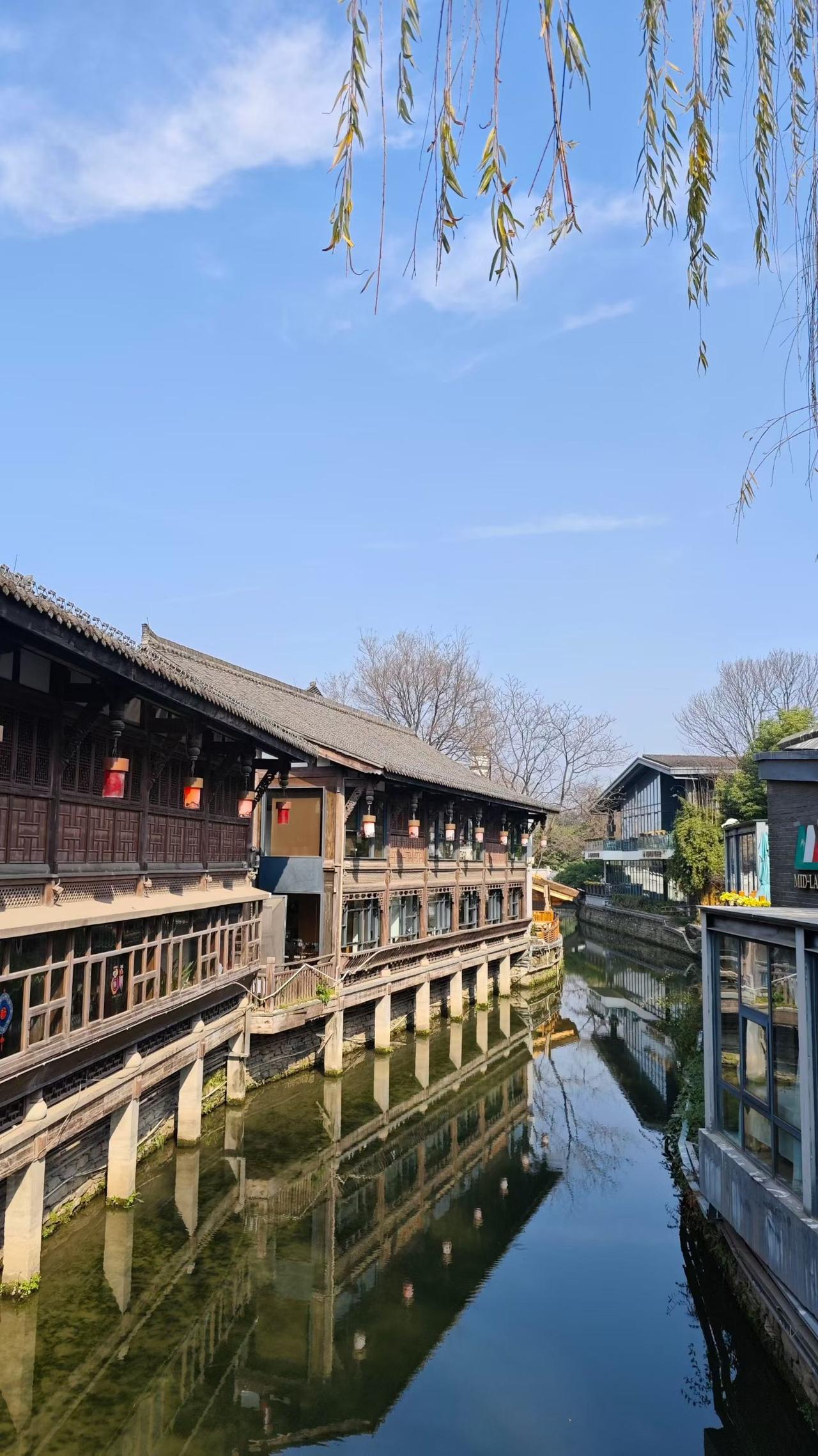 大年初四,成都天气真给力。湛蓝天空,艳阳高照,气温有22度,把节日气氛暖意拉满。 春节期间成都的热门景点,游人如织,人山人海,热闹非凡。咱就不想去凑热闹了。 走出家门,到铁像寺水街走一走,那里自然风景与人文气息完美结合,值得浏览。 一条水街,半城烟火。 都市繁华与静谧,只有一水之隔,喧嚣归于流水,内心归于平静。 漫步古香古色的水街,是一种休闲惬意生活方式温柔的回响,不由得放飞自我,神清气爽。[祈祷][福][玫瑰][大笑]