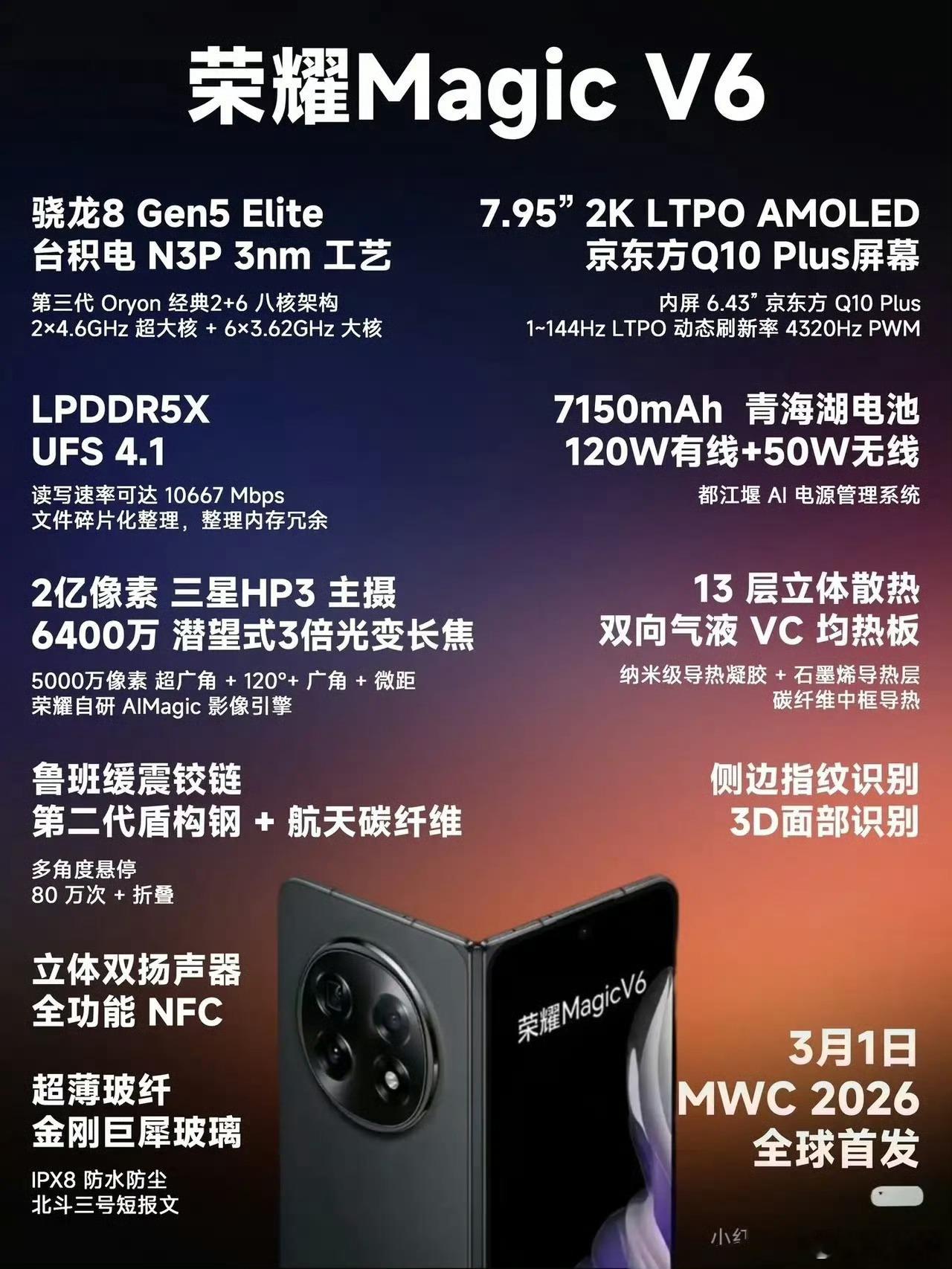 荣耀Magic V6传闻参数:满血骁龙8 Elite Gen 57150mAh电池120W有线+50W无线7.95英寸2K LTPO外屏6.43英寸1-144hz内屏侧边指纹+3D面部识别2亿主摄+6400万潜望3倍光变+5000万超广角